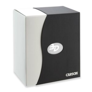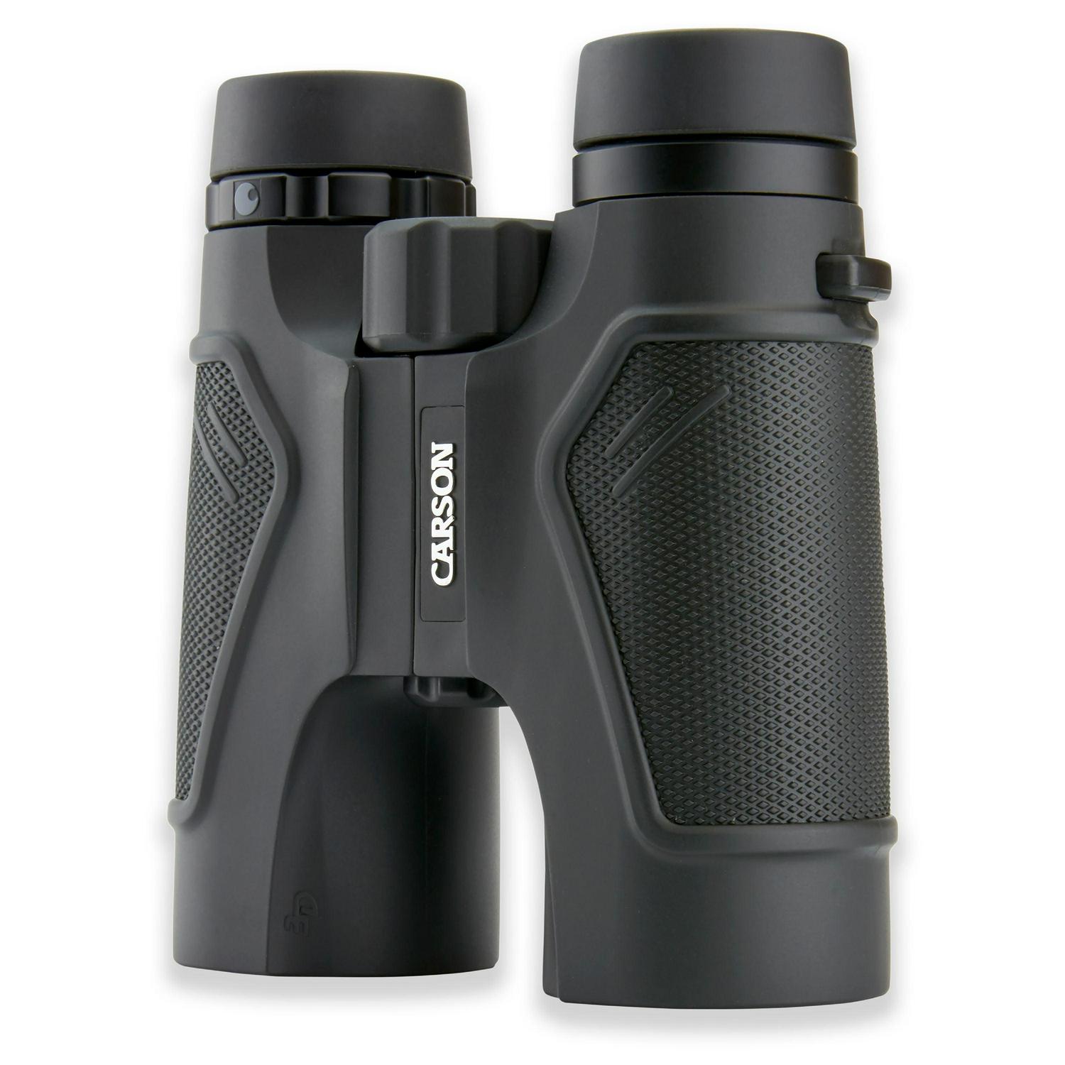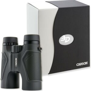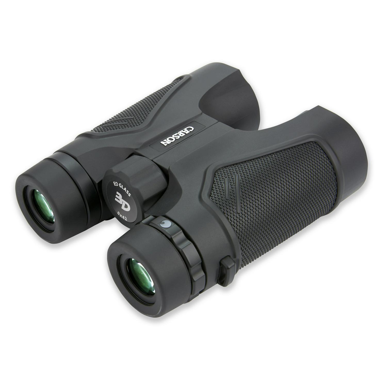 Carson 3D Series High-Definition Waterproof Binoculars with ED Glass (Black). The full-sized 3D Binoculars combine our HD optical coating technology with ED glass to give you the brightest, and clearest image possible. Tough Construction The 3D Series Binoculars with ED Glass is ideal for use as Hunting Binoculars or Birding Binoculars. Rubberized armor coating makes this Full-Sized 3D Binocular rugged and shock proof. The body is nitrogen purged and O-ring sealed making them waterproof and fog-proof. Ready for the Great Outdoors The precisely placed thumb grooves, “just right” texturing and all-over lightweight body ergonomics make the 3D Series Binoculars perfect for long hunts or bird watching expeditions. The 3D Series is also perfect outdoor activities or sporting events. Usable with Eyeglasses Extra- long eye relief with twist down eyecups make this Full-Sized 3D ED Glass Binocular perfect for eyeglass wearers. The case for this device contains magnets which can interfere with pacemakers and implantable cardioverter defibrillators (ICD s). Individuals with pacemakers or ICD s should NOT use this product.