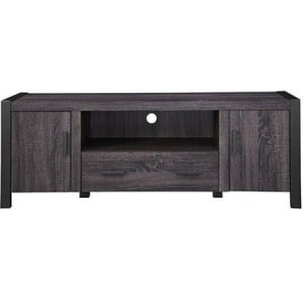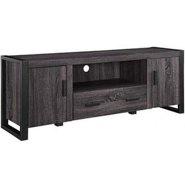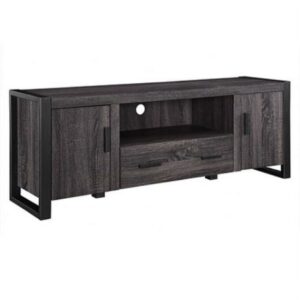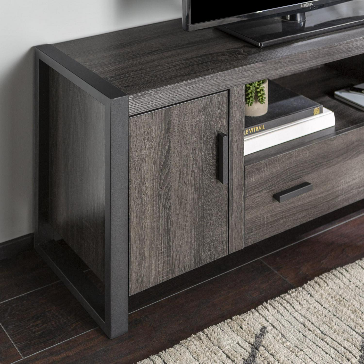 Keep it cool with the Carson 60 Console by River Street Designs. A slick blend of materials and open and closed storage makes this urban industrial TV stand a sturdy and sophisticated choice. It has continuous powder-coated metal legs and elongated handles that accentuate the gritty edge of this entertainment center. On either side of the console are doors with adjustable shelves behind them. The center of this TV console has one low drawer that provides more closed storage options, while above it is an open space that s ideal for gaming consoles, smart home devices, or DVD players. Plus, the cord management option in that open shelf helps organize the cords from all your electronics. This stand can accommodate TVs up to 66-inches.