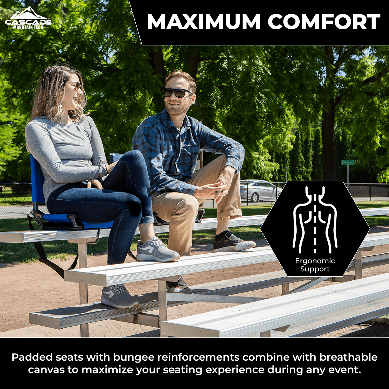 The Cascade Mountain Tech Lightweight Stadium Seat offers comfort and support for hours on wood or metal bleachers. With a spacious 17-inch padded seat and 15-inch-high backrest, it’s perfect for bleachers, picnic tables, and park benches. Made from durable, water-resistant canvas, it’s great for any weather. Set it up easily by unfolding and securing it with the built-in bleacher hook. Carry it effortlessly with the shoulder strap and cushioned handle.