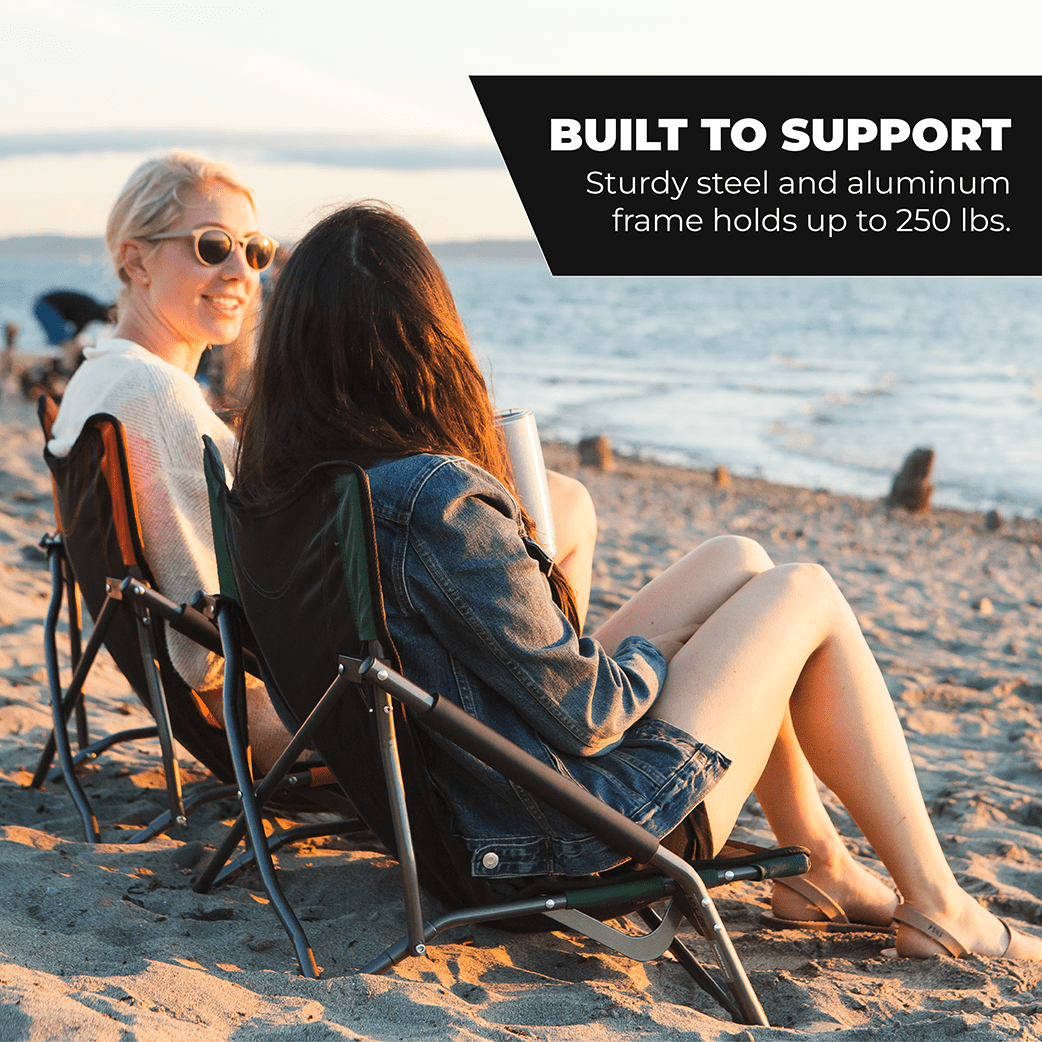 Versatile uses and compact: Ideal for camping trips, beach outings, sporting events, outdoor concerts, and beyond! This low-profile chair is versatile, lightweight, and folds conveniently for easy transport. Comfortable: With breathable mesh fabric and cushioned armrests. Compact: 22″ high and 20″ wide, Sits 5″ off the ground allowing you to easily snuggle up by the campfire. Folds up fast and stows easily (26″x8″ folded). Convenient: Handy storage bag with shoulder straps included for easy transportation and storage. Carrying weight is under 7 lbs. Capable: Strong steel and aluminum frame holds up to 250 lbs