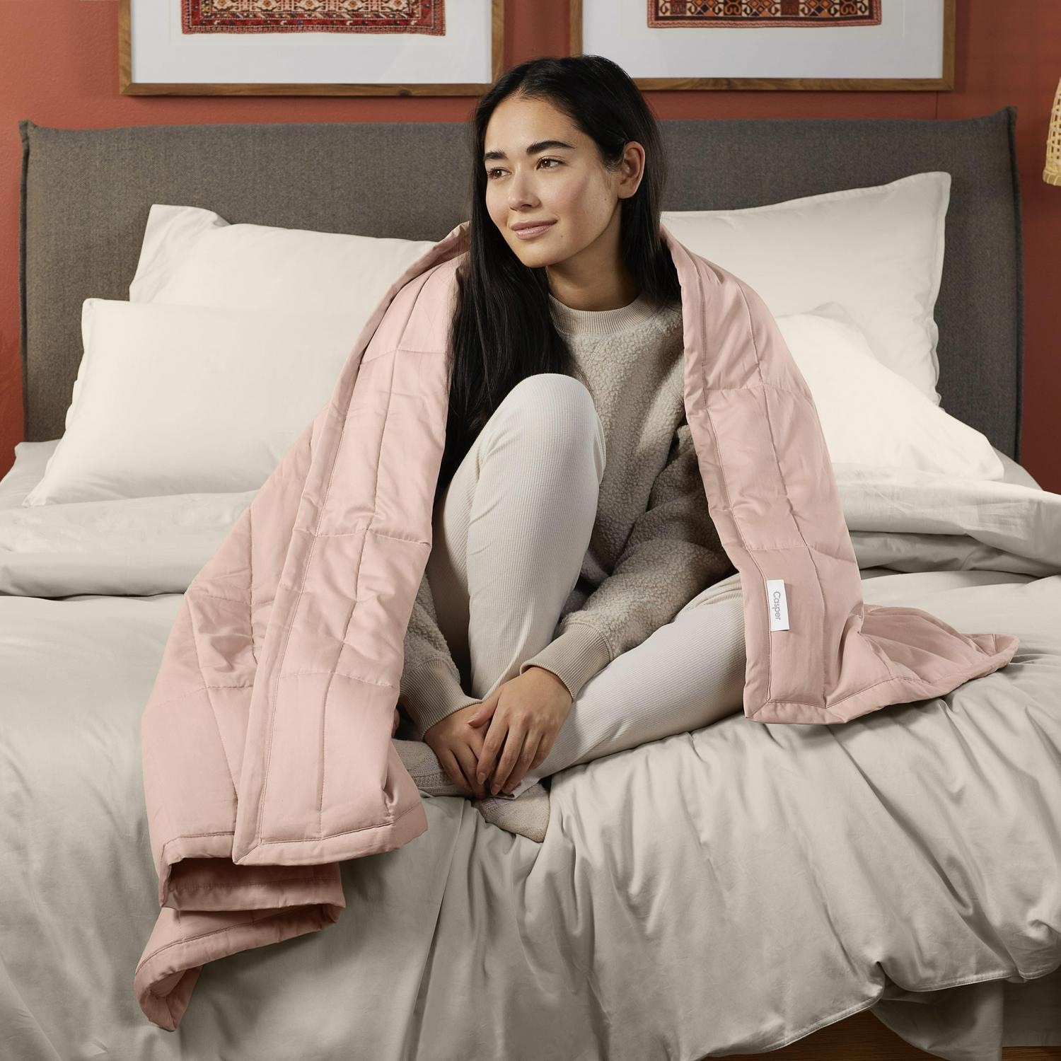 Weighted feel comforts you to sleep. Weight can have a calming effect, reducing anxiety and helping you relax. Quilted design hugs around you. Small channels keep the microbead fill in place to wrap around your body better. Superior airflow keeps you cool. Breathable cotton cover helps circulate air away from your body to keep you comfortable. Designed for relaxation, our Weighted Blanket hugs your body with a cozy, calming feel. We recommend 10% of your body weight for optimal comfort.