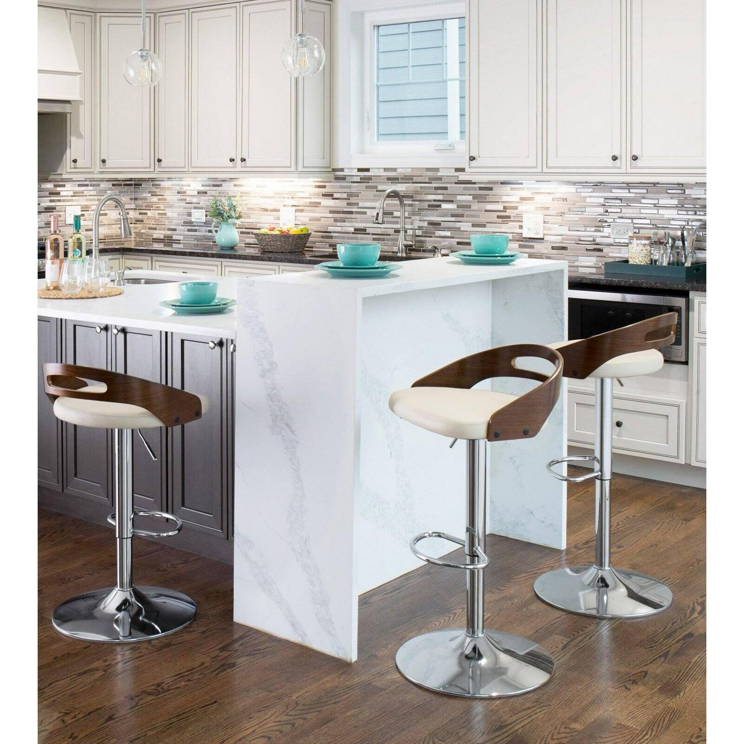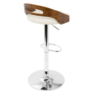 The LumiSource Cassis Barstool makes a strong statement with a modern, low-profile bent wood back which curves into a wide, generous seat. Form and function unite with easy-to-clean faux leather seating and a convenient footrest resulting in a stylish updated look. Mid-Century Modern styling. Seat adjusts from counter to bar height. 360 degree swivel. Low, curved backrest with cushioned seat. Sturdy chrome footrest. Indoor use only, 250 lbs. weight limit, Assembly required.