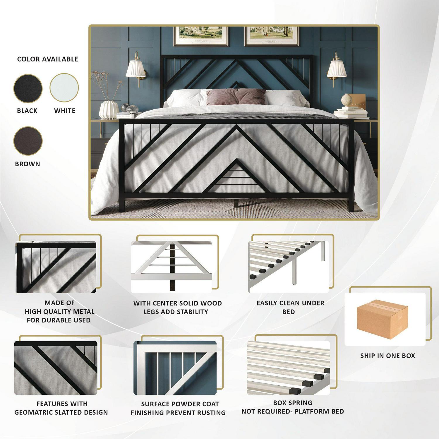 With a modern and stylish look, this metal bed frame is a good choice that offers great durability, functionality. Featuring a geometric slatted design on the headboard and footboard, this bed frame adds a touch of glam and attractiveness to your space. Crafted from high-quality metal and solid wooden slats, this bed frame is built to last and can adapt to various amounts of weight. Enjoy ample storage space under the bed to keep your bedroom tidy and organized, while the extra center solid wood legs offer more support and can sustain heavier weight without any damage. Finished with a surface powder coat to prevent rusting, this bed frame requires less maintenance, allowing you to relax in style without any hassle. Shipped in one box and no box spring required, this bed frame is available in three color options – Black, White, and Brown – and in Twin, Full, Queen, and King sizes, making it a versatile choice for any personal style and room size. It easy for an adult fully assembly it. Upgrade your bedroom to a whole new level with this amazing bed frame that offers both durability and style!