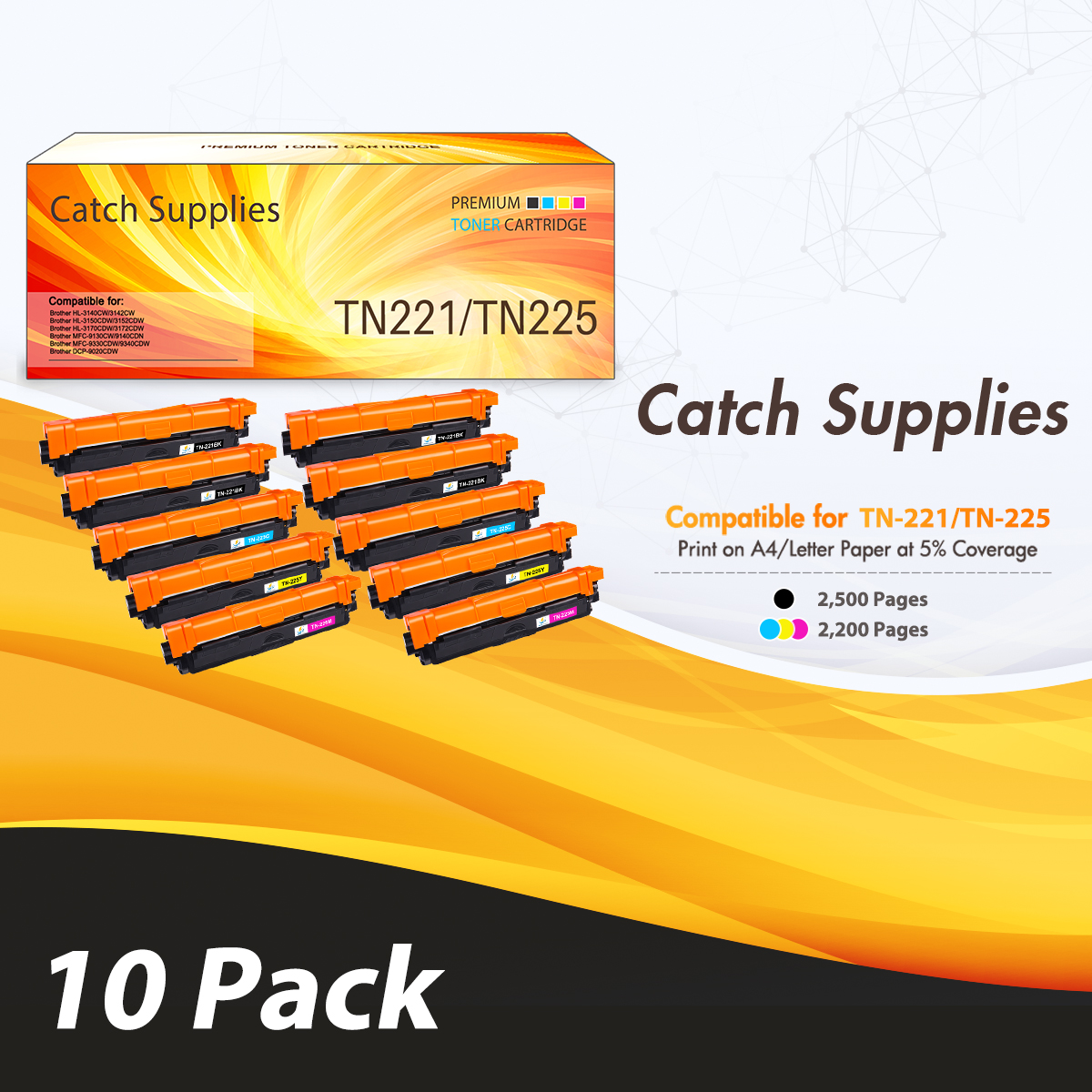 Catch Supplies Compatible Toner Cartridge for Brother TN-221BK TN-225C TN-225M TN-225Y 10-Pack Compatible Toner Cartridge Est Page Yield : 4*2500/6*2200 Pages Color: 4 * Black, 2 * Cyan, 2 * Magenta, 2 * Yellow Compatible Toner Cartridge Replacement for Brother HL-3140CW/3142CW/3150CDW/3152CDW/3170CDW/3172CDW, MFC-9130CW/9140CDN/9330CDW/9340CDW, DCP-9020CDW This product is not affiliated with nor manufactured by Brother International Corporation therefore, Brother makes no representations or warranties regarding the quality of the product.
