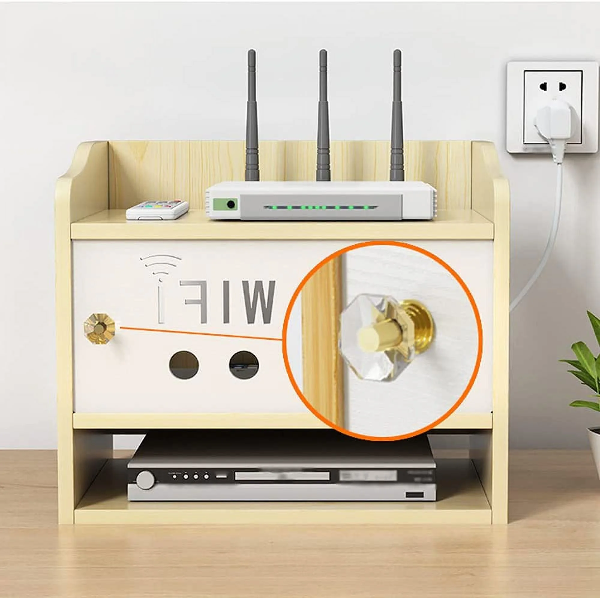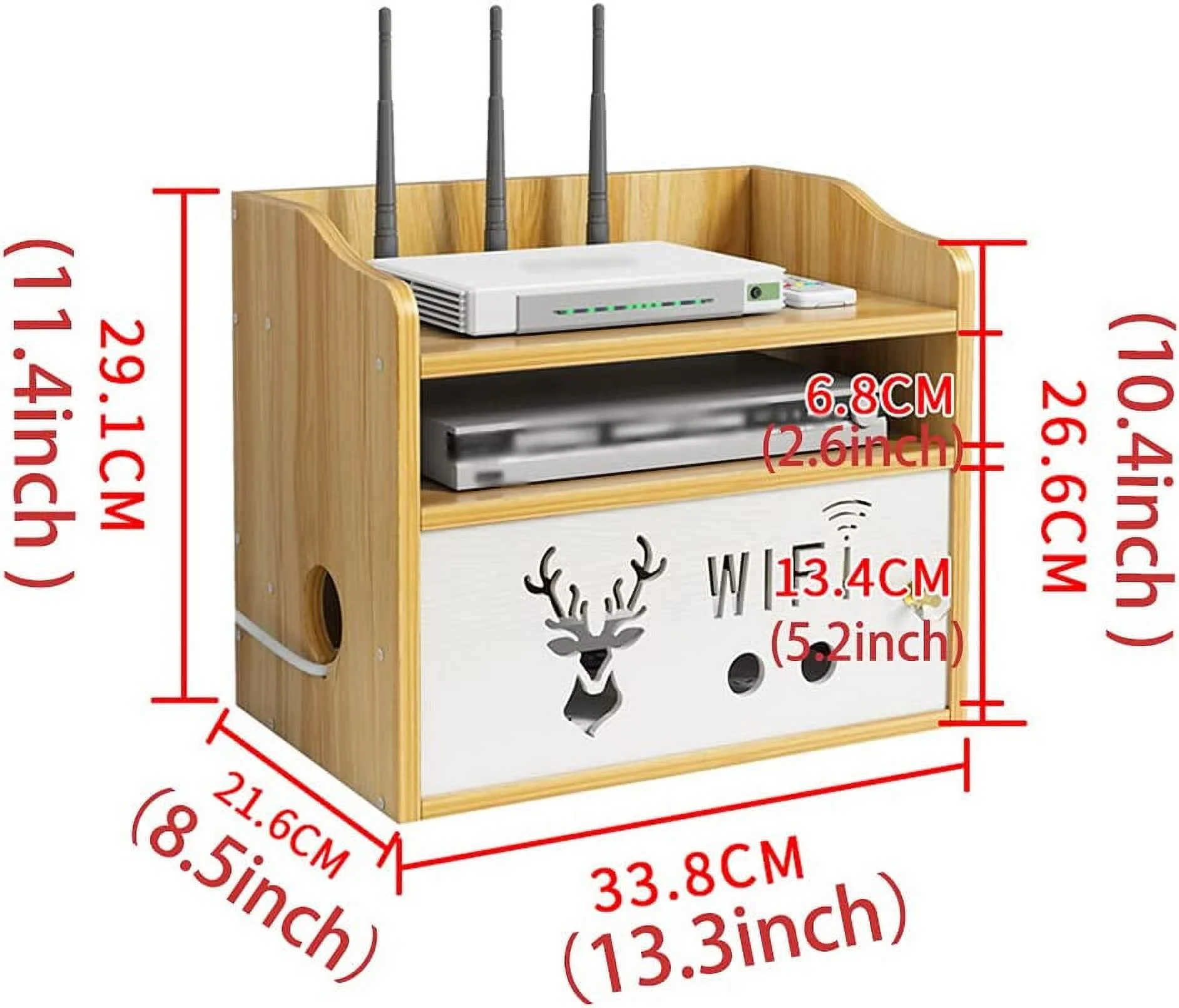 Feature: 【Multi-Function】 This WiFi Router Storage Box can be equipped with wifi routers, set-top boxes, sockets, optical fiber routers, small DVDs, small game consoles, etc. 【Wooden Board Thickness 9mm】This Wireless Router Storage Box is made of thick solid wood boards with a thickness of 9mm. After assembly, it is very strong, not easy to damage, and has strong load-bearing capacity. 【Three Compartments With Threading Holes Reserved】This Wall Shelves Stuff has 3 compartments, which are convenient for storing various items and electrical appliances. There are threading holes on the side to organize wires without clutter. 【Hole-Out Design, good for heat dissipation and ventilation】The front and back panels have a hollow design, which is good for heat dissipation and ventilation of the machine, does not block the signal, and effectively extends the life of the machine. 【Safety Partition Design】There is a switchable baffle on the front of This Router Storage Box, which shields the power strip to prevent children from touching and avoid danger.