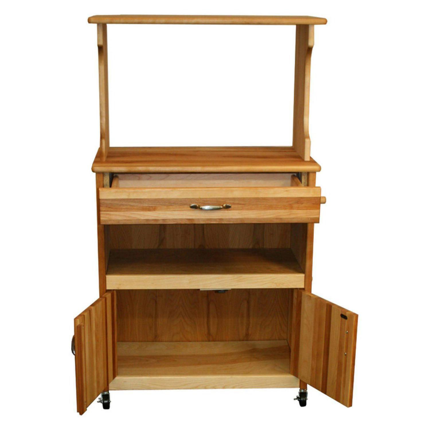 The Catskill Microwave Cart with Open/Enclosed Storage offers a stylish work space with handy organization options. This versatile cart is made of a Northeastern hardwood and features a natural oil finish and a classic butcher block top. A center open shelf provides easy access to pots, pans, dishes, or other kitchen essentials. Lower doors open to reveal spacious storage and adjustable shelving for serving dishes or appliances. A top drawer keeps other necessities like knives or cookware close at hand. The integrated microwave shelf keeps your oven right where you need it. Smooth-rolling casters let you maneuver this cart wherever it’s needed while two locking casters keep it in place. Proudly made in the USA with sustainably harvested domestic hardwood.