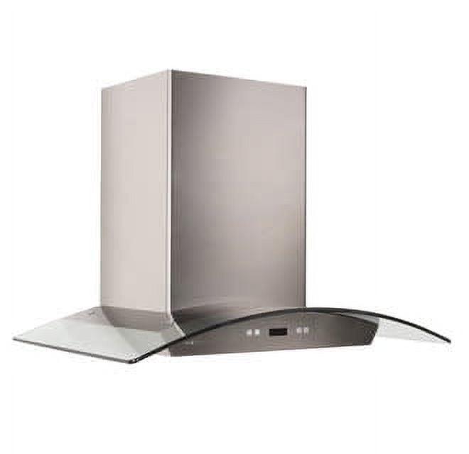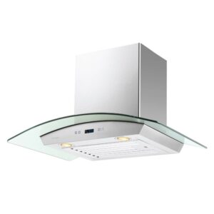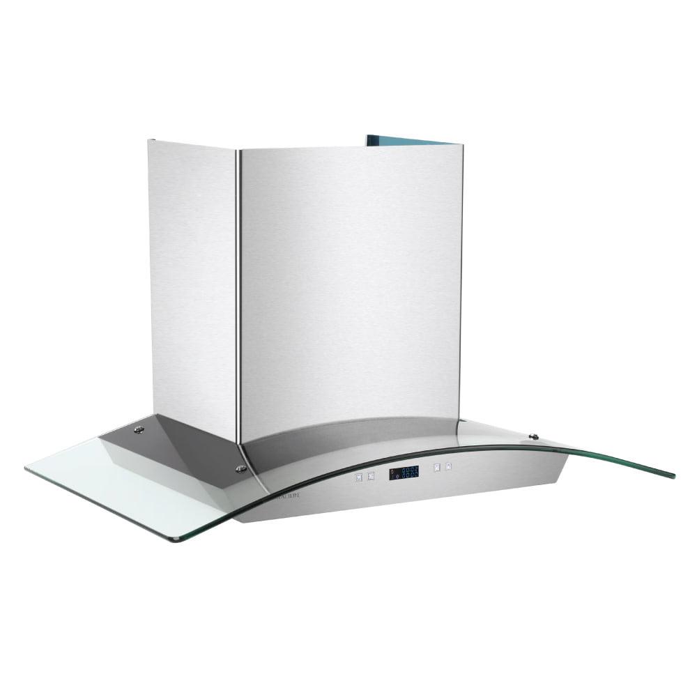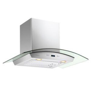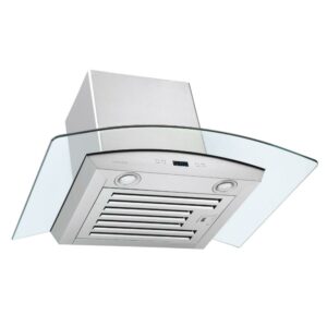 Glass meets stainless steel on the Cavaliere Euro 30W” Wall Mounted Range Hood. It offers a sleek way to keep your air clean and prevent smokey residue. This is made of brushed stainless steel with a curved tempered glass top. It is an ideal match for a modern canteen. This work of art is as stylish as it is efficient. It features a quiet blower motor that quickly clears your cooking area’s air. It also has six fan speeds so you can customize the level of fan you need for each dish. The kitchen wall mount range hood has dishwasher-safe filters for easy and convenient care. Additionally, this product has two dimmable 35-watt halogen lights to safely and effectively illuminate your stove top cooking. The canopy range hood has a touch-sensitive keypad with a LCD display that makes it a snap to use, even on the first try. This product is also modifiable and has a telescopic chimney that fits up to a 9′ ceiling, with smokestack extensions available for taller ceilings.