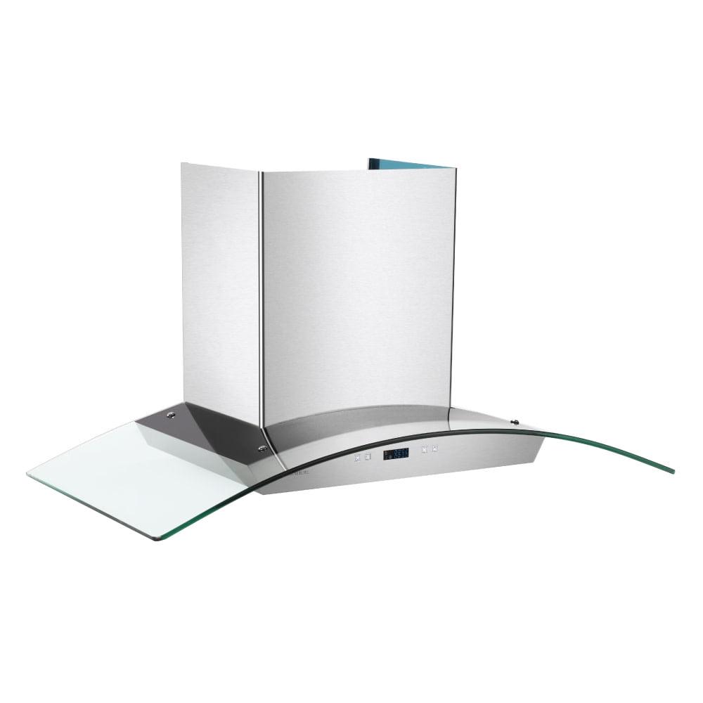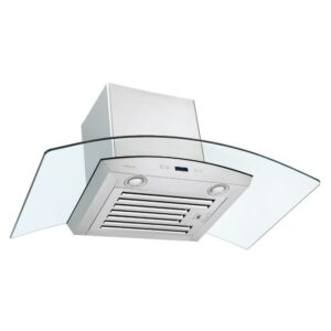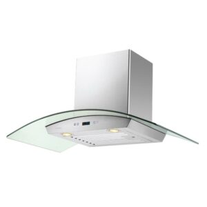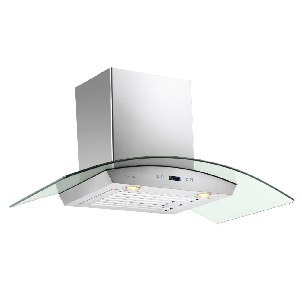 With its clear glass and sleek stainless steel design, the Cavaliere 36W in. Tempered Glass Canopy Island Range Hood makes your kitchen island stylish and smart. A sleek way to clean the smoke and odor from your kitchen, this range hood has a slim profile and is made of 19-gauge brushed stainless steel with a curved, tempered glass top. It offers a quiet centrifugal motor that makes quick work of clearing the air. Six speeds, dishwasher-safe filters, and four dimmable 35-watt halogen lights make it practical. The dual touch sensitive keypad, 30-hour cleaning reminder, and delayed power auto shut off make it a snap to use.