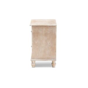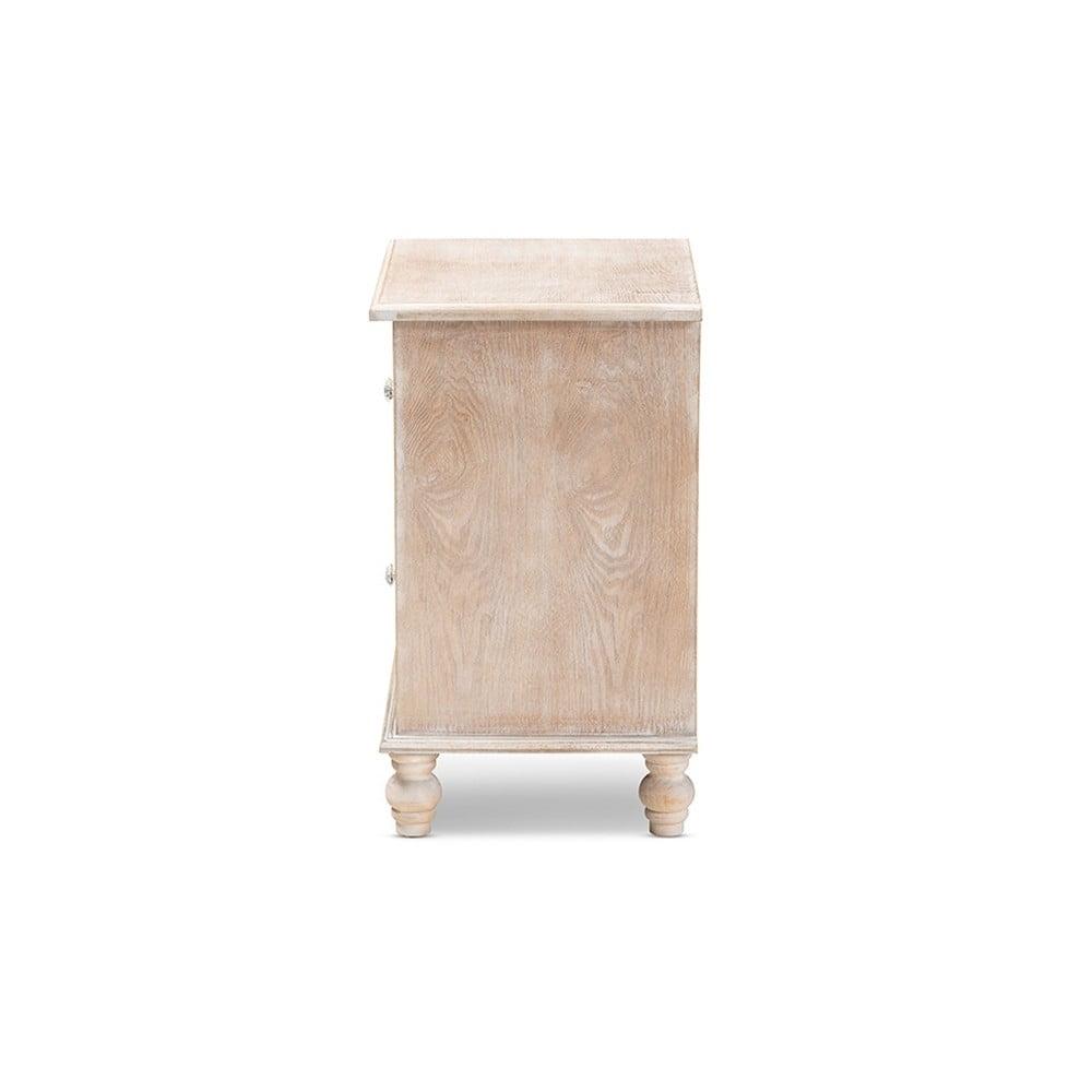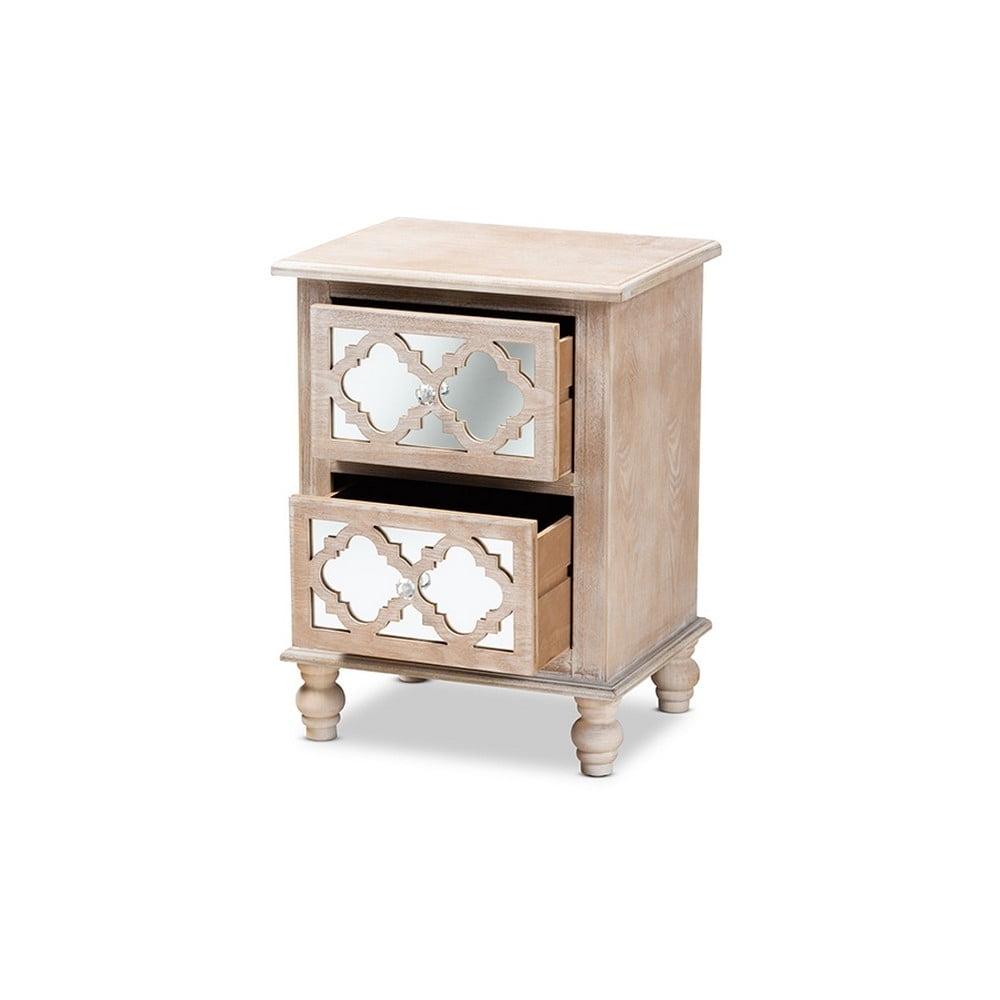 Celia Transitional Rustic French Country White-Washed Wood and Mirror 2-Drawer Quatrefoil Nightstand A unique mix of rustic and glam makes the Celia nightstand a chic bedside companion. This wood nightstand displays a white-washed oak finish for an aged, vintage look. Two drawers provide ample space to store all the bedroom essentials. Mirrored glass adds a hint of glamour and highlights the elegant quatrefoil pattern layover. Crystal knobs and turned feet add an extra dose of charm. The Celia nightstand is made in China and will arrive fully assembled.