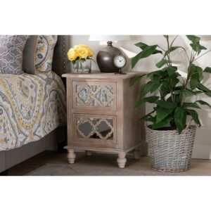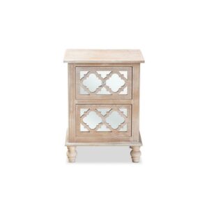 Celia Transitional Rustic French Country White-Washed Wood and Mirror 2-Drawer Quatrefoil Nightstand