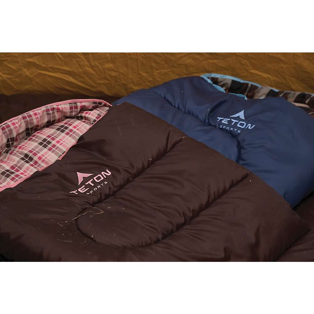 TETON Sports 20 F Semi-rectangular Sleeping Bag: Kid’s sleeping bag is 66″ long by 26″ wide, a full 10″ longer than most kids sleeping bags Sturdy taffeta shell stands up to years of use Sturdy no-snag two-way zippers with metal pulls Full-length zipper draft tube keeps the warm air in Curved hood keeps head or pillow off the ground Stuff sack included Sturdy taffeta shell stands up to years of use Sturdy no-snag two-way zippers with metal pulls Full-length zipper draft tube keeps the warm air from escaping Right and left zippered bags zip together Curved hood keeps head or pillow off the ground