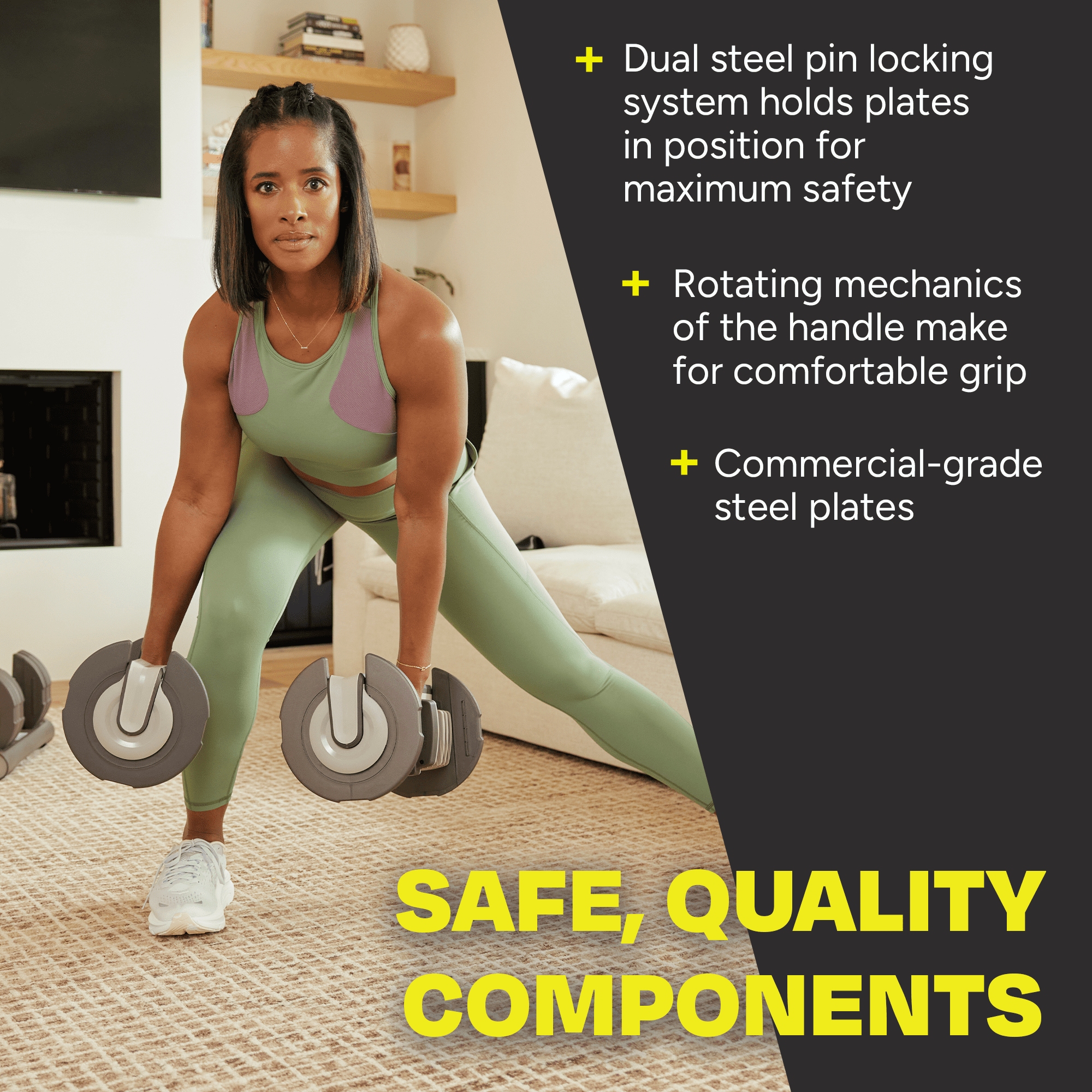 The Centr Smart Stack 50 adjustable dumbbell is engineered for strength, comfort, and durability. Designed to let you train with ease, simply rotate the bi-directional ergonomic handle to select your preferred weight from 5 lbs to 50 lbs per dumbbell. The Centr Smart Stack 50 comes with Centr’s connected digital coaching offering hundreds of workouts to train with your adjustable dumbbell. The Centr Smart Stack 50 is constructed for a safe and efficient workout. A dual steel pin locking system ensures each plate is locked into place when in use and the magnetic base keeps the weight plates organized for quick and easy weight selection. Also, the streamlined design highlights the weight viewfinder, in both LB and KG, which quickly tells you what weight you are lifting. This adjustable dumbbell is made from commercial-grade components to withstand heavy use and ensure durability. Its compact space-saving size, measuring just 16.5” L x 7.9” W, allows you to replace up to 20 individual dumbbells (per pair) and maximize the space in your home gym. The Centr Smart Stack 50 adjustable dumbbell includes a 3-month digital membership ($59.99 value) to the Centr app where you can unlock the full potential of your Centr Smart Stack 50 with training, nutrition, and mindfulness coaching from Chris Hemsworth’s expert team.