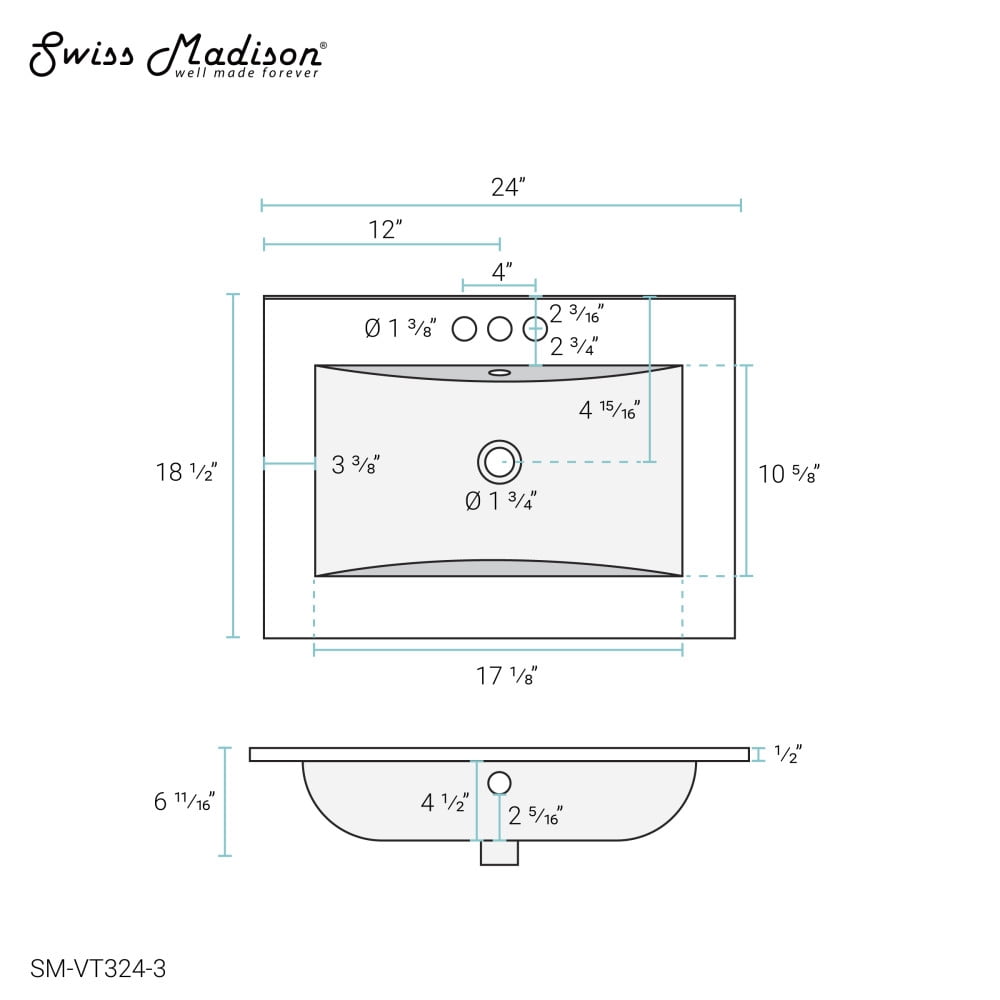 Three Hole Center Set Faucet Mount Easy Drop-in installation Durable & scratch-resistant non-porous finish. Easy-to-clean polished surface Compatible with Swiss Madison Pop-up drains 1 Year Limited Warranty Included *Drain sold separately