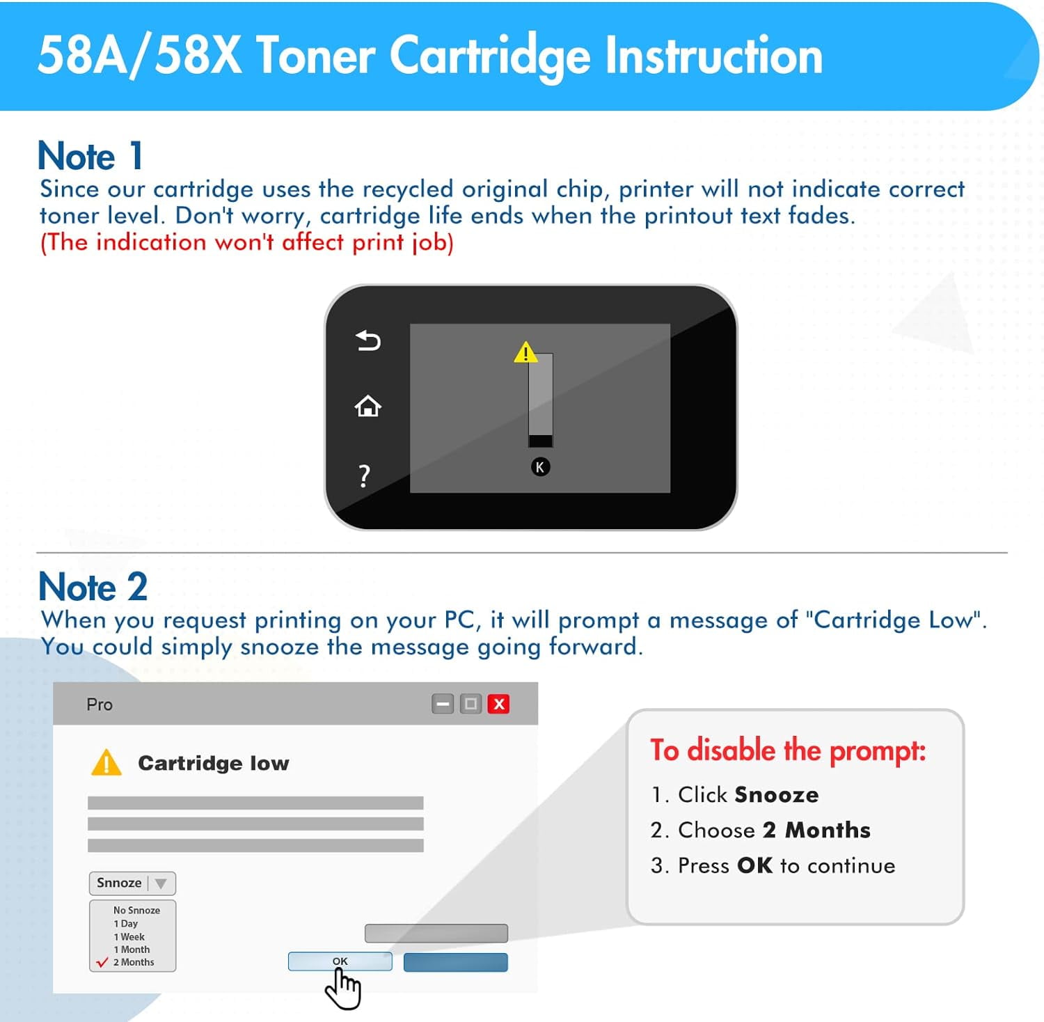 NOTE: 58X 58A Toner Cartridge for hp 58a cf258a 58x cf258x black toner cartridge is three times the print page production of the CF258A toner cartridge or HP 58A toner cartridge black. 🎁 【PACKAGE INCLUDED】: 3 Pack CF258X Black Compatible Toner Cartridges Replacement for HP CF258X 58X CF258A 58A with Chip ✔ 【CHIP NCLUDED】: Yes, With 58A 58X Chip ✔ 🌈 【INK COLOR】: CF258A CF258X Black 📑 【PAGE YIELD】: 3 * High Yield 10,000 Pages per 58X Black Toner Cartridge (Letter/A4, at 5% Coverage) 🖨️ 【COMPATIBLE WITH PRINTERS】: 🖨️ HP LaserJet Pro M404n M404dn M404dw M404 🖨️ HP LaserJet Pro MFP M428fdw M428fdn M428dw M428 🖨️ HP LaserJet Enterprise M406 MFP M430 🖨️ HP LaserJet Pro M304 M304n M304dn ⭐Warm tips:⭐ ✅If you encounter any difficulties during the use of the product, please contact us promptly. We are pleased to assist you and wish you a happy life every day (“Order List” -> Search “Order ID -> Click “Contact Seller”.) Toner Bank Compatible 58X CF258X high yield toner provide high-quality printing and produce excellent results 💛CF258X 58X Toner Cartridge Black 3 Pack 💛(with Chip, High Yield) Compatible for HP CF258X 58X 58A CF258A MFP M428fdw M428fdn M428dw M404 M428 Pro M404n M404dn M404dw Printer 【Reliable Service】 If you have any questions, please contact us, we will provide you with the best service and solve all difficulties for you. After-Sale Service: 24 months warranty, 24 hours can contact customer service at any time. Our compatible 58A WC toner cartridge is designed to meet or exceed OEM specifications, providing reliable and consistent performance. And with a high-yield capacity, you can print more and replace less frequently, saving you time and money. 【Easy to Install】 1️⃣Shake the new toner cartridge gently from side to side to distribute toner powder evenly 2️⃣Remove the orange plastic shield 3️⃣Put the new cartridge firmly into the drum unit until you hear it lock into place 4️⃣Install the toner cartridge and drum unit assembly back into the machine ✅ Due to using the oem old chips, the printer will prompt a message “Cartridge Low”, which does not affect normal printing. Please click “Snooze” and choose “2 Months” to close prompt. The cartridge’s life ends when the printout text fades 𝑵𝑶𝑻𝑬 1 When printer displays “The indicated cartridges are non-HP cartridges” message, please press OK to continue. 2 When printer displays ” Memory error on indicated cartridges, Event Code: 10.00.00″, please try opening and closing the printer front door. Then an on-screen message “The indicated cartridges are non-HP cartridges” will be prompted, please press OK to continue.