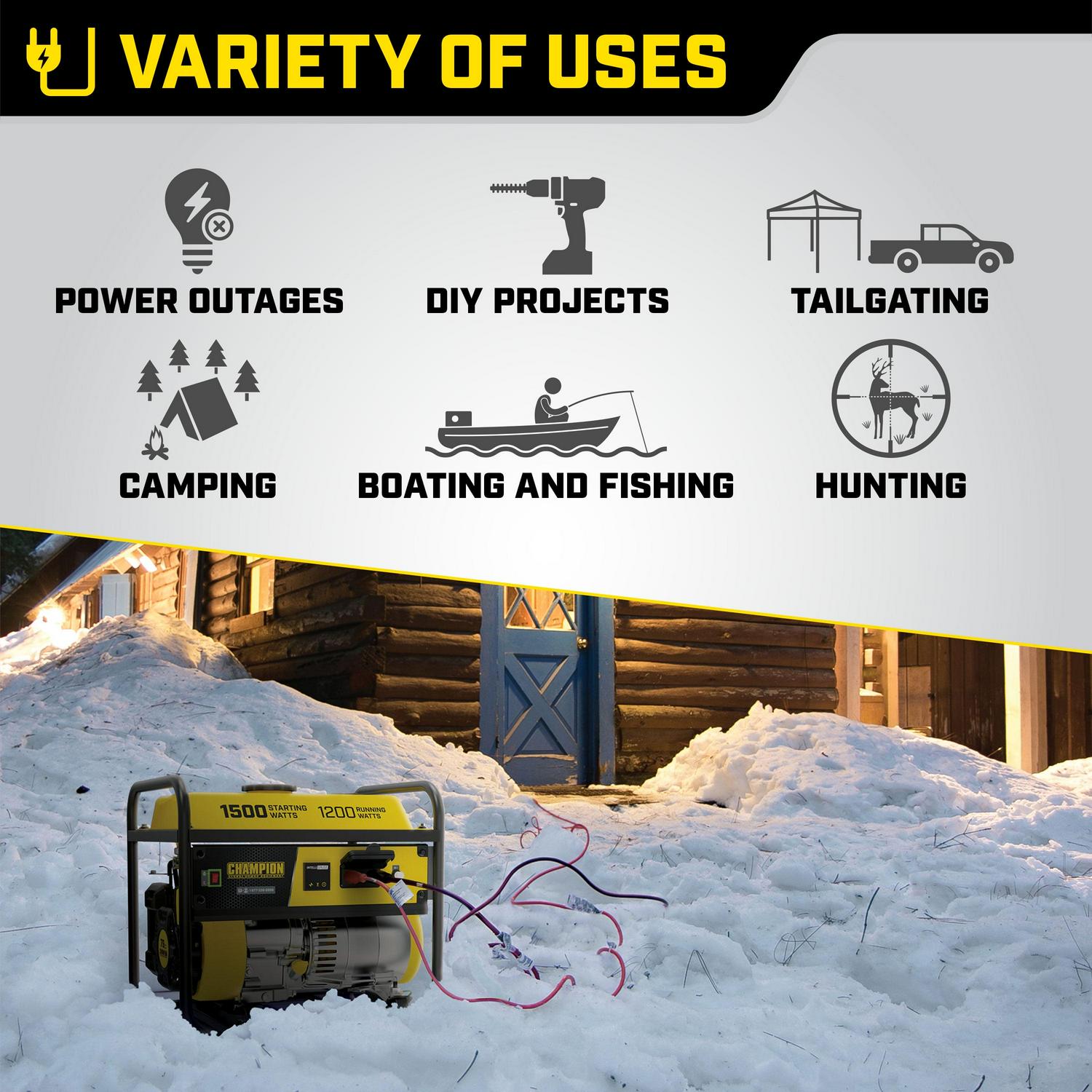 The Champion Power Equipment 200915 1200-Watt Multi-Purpose Portable Generator is designed with your safety and convenience in mind, and is the perfect what if generator. At 1500 starting watts and 1200 running watts, this rugged generator with its durable steel frame is easy to transport and provides just what you need for RV use, camping, tailgating, boating, hunting, weekend trips, family vacations and small jobs around the house. The next time there s an outage, the 79cc Champion single-cylinder OHV engine will provide the power you need for a few essential items in an emergency – lights, microwave, fan, TV, modem/router, cell phone charger, etc. (Note: this unit is not recommended for emergency home backup for powering air conditioners, stoves, furnaces or sump pumps). Power up with Champion s reliable recoil start, plus Cold Start Technology ensures a quick start in cold weather. Champion also makes it easy to monitor voltage, frequency and operating hours with Intelligauge. This unit includes two 120V 20A covered household outlets (5-20R). Designed for safety with convenient push-to-reset circuit breakers, a low oil shut-off sensor plus an included oil funnel for easy changes. The reliable 80cc single-cylinder OHV Champion engine produces 1500 starting watts and 1200 running watts, and will run for up to 10 hours at 50% load when the 1.5-gallon tank of gasoline is full. Champion s thoughtful packaging and clear directions make setup hassle free.