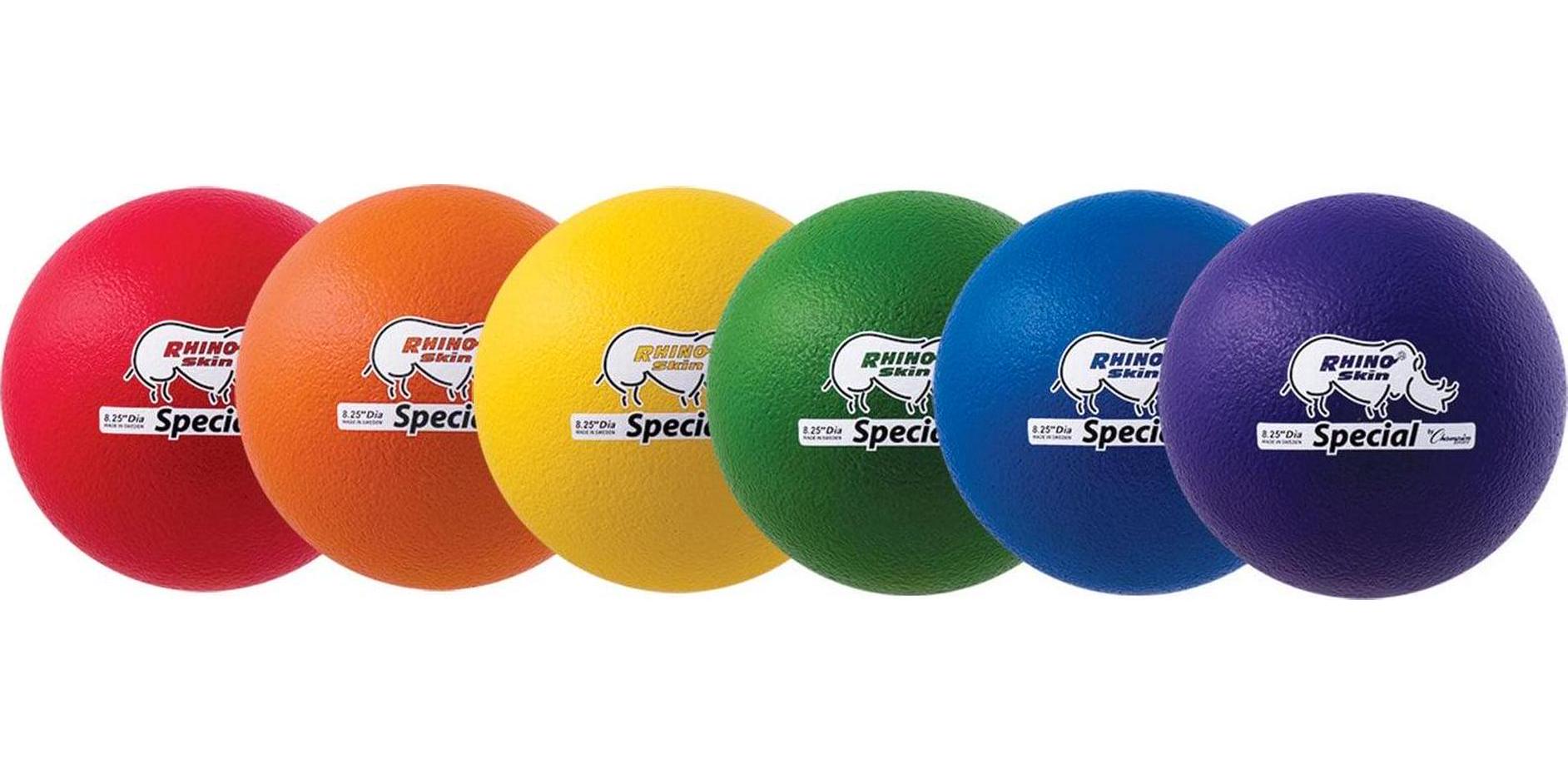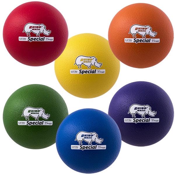 A great addition to any gym class or recreational league, the Champion Sports 8.5 Inch Rhino Skin Medium Bounce Special Ball Set includes six balls made with a tear-resistant Rhino Skin coating, ensuring they are durable enough to withstand daily use and intense games of dodgeball. As well, the core is made from medium-density foam, providing players with more control and accuracy when throwing. For games of dodgeball, handball, or anything else on the playground, this set is a great choice.. Rhino Skin coating for exceptional tear resistance Medium density foam core and soft exterior 8.25″D Ball weight: 200 g Foam density: 35kg/m3 Set of 6 balls (1 of each) Red, Orange, Yellow, Green, Blue & Purple