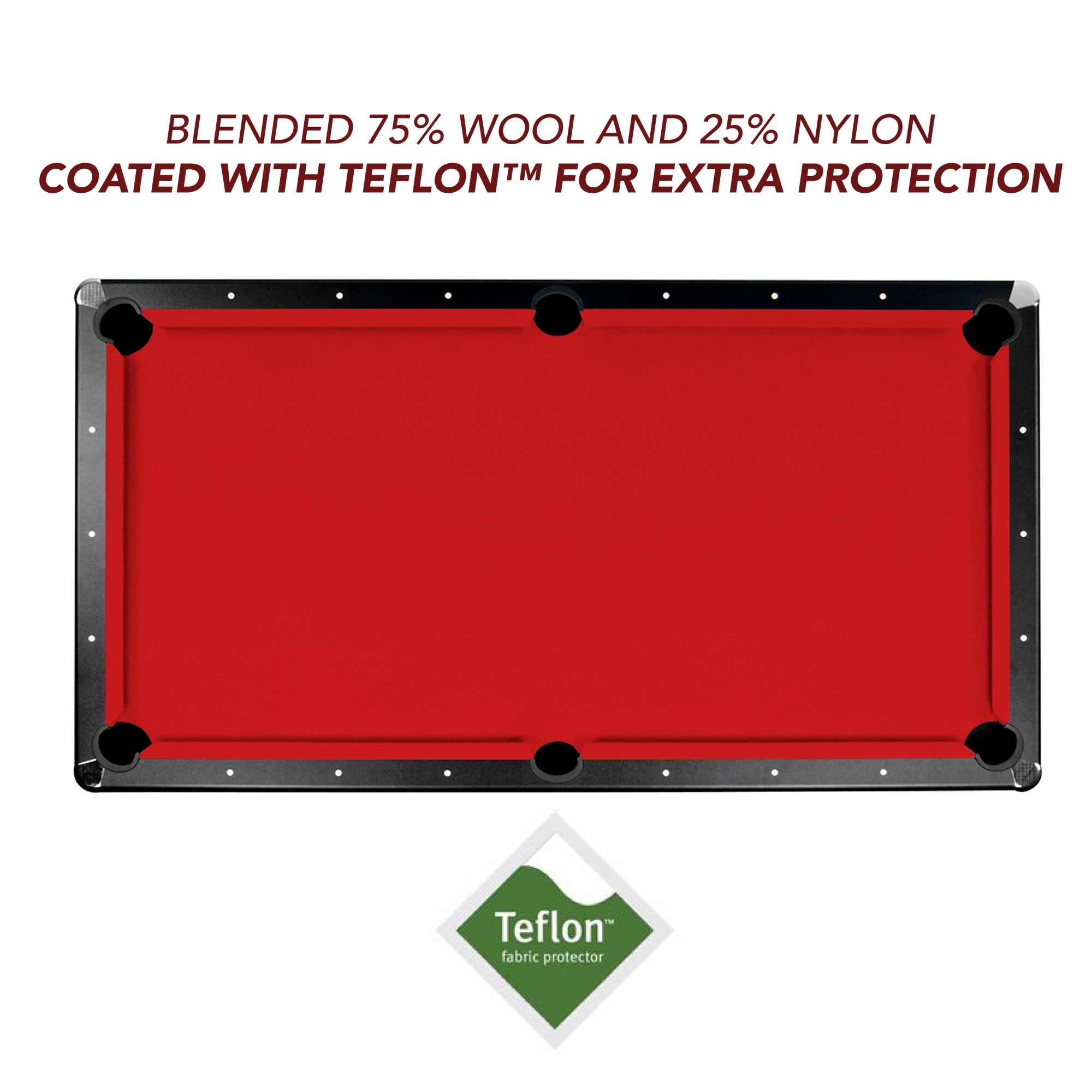 Liberally cut 6 rail cloths plus 7-ft bed cloth: 90-in x 48-in 75% Wool 25% Nylon blended woolen fabric Blended Wool and tight weave provide superior cloth stretching capability Coated with DuPont Teflon for added stain resistance INCLUDES: Includes table spot and 2 pieces of color matched cue chalk