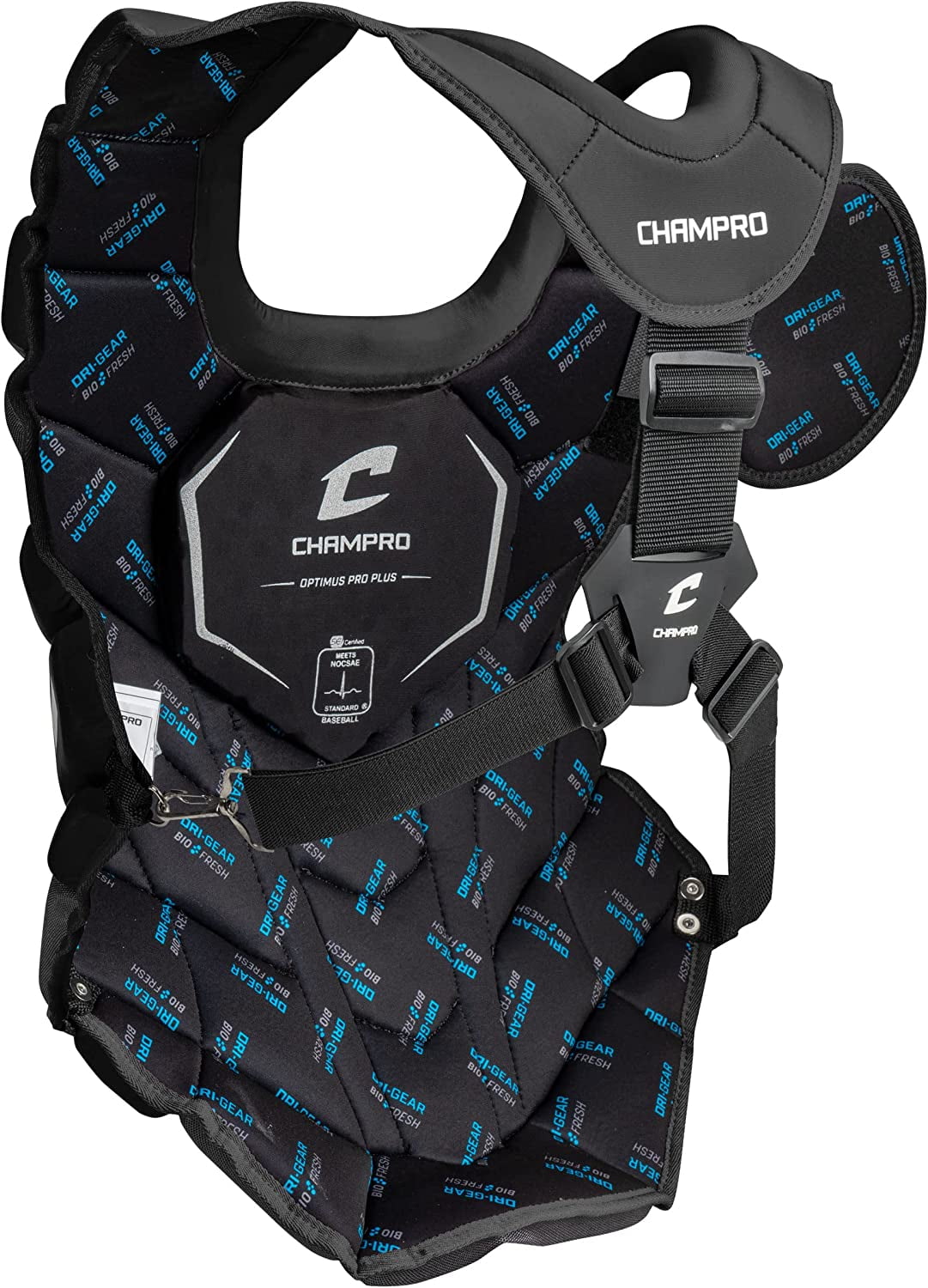 The CHAMPRO Optimus Pro Plus is a durable chest protector that is SEI certified to meet NOCSAE standards for Commotio Cordis in baseball. More compact than competing chest protectors, the cardiac pad’s low profile design enables easy movement and flexibility when crouched behind the plate. Multilayered low-rebound foam prevents balls from bouncing wildly, maximizing catchers’ blocking and retrieving efficiency. The contour-molded Dri-Gear liner wicks away moisture and helps keep catchers comfortable and dry on hot days, while the Bio-Fresh treatment provides an extra level of freshness preservation. The shoulder cap snaps on and off for removal or repositioning, so catchers can adjust it to their preference. Available in Adult (16.5” long), Intermediate (15.5”), and Youth (14”) sizes in 4 color options.