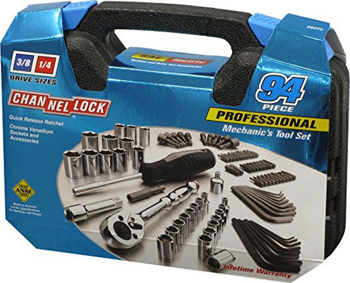 CHANNELLOCK Mechanics Tool Sets come equipped with a full selection of the most commonly used sockets, wrenches, ratchets and more all contained within a durable molded case for easy and secure storage. Deep and standard sockets feature DYNA DRIVE technology which offers 20% more torque, eliminates slippage, and prevents damage to fasteners. The 39067 132 piece CHANNELLOCK Mechanics Tool Set includes 3/8 and 1/4 inch drive, Combination Wrenches, Quick Release Oval Head Ratchet, Extensions, Standard and Spark Plug sockets, 3/8 to 1/4 reducing adapter, SAE and Metric 8pc Hex Key Set, and a high torque Magnetic bit Nut Driver with 4 bit sets. The 39067 132 piece CHANNELLOCK Mechanics Tool Set is made to A.N.S.I. standards in Taiwan.
