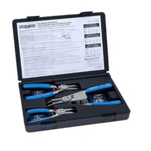 CHANNELLOCK Retaining Ring Pliers easily convert from working with external to internal snap rings with a simple switch of a tab. The heavy duty return spring reduces hand fatigue and provides increased accuracy when applying or removing snap rings. CHANNELLOCK Retaining Ring Pliers include 5 pairs of interchangeable tips. The RT-3, 3 piece kit includes 3 size Convertible Retaining Ring Pliers, 6″, 8″, and 10″ all in a durable molded case for convenient storage.