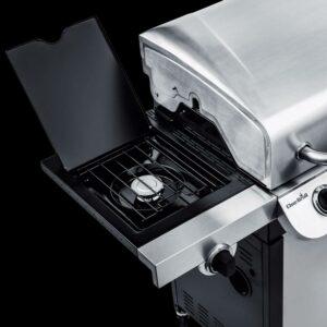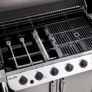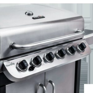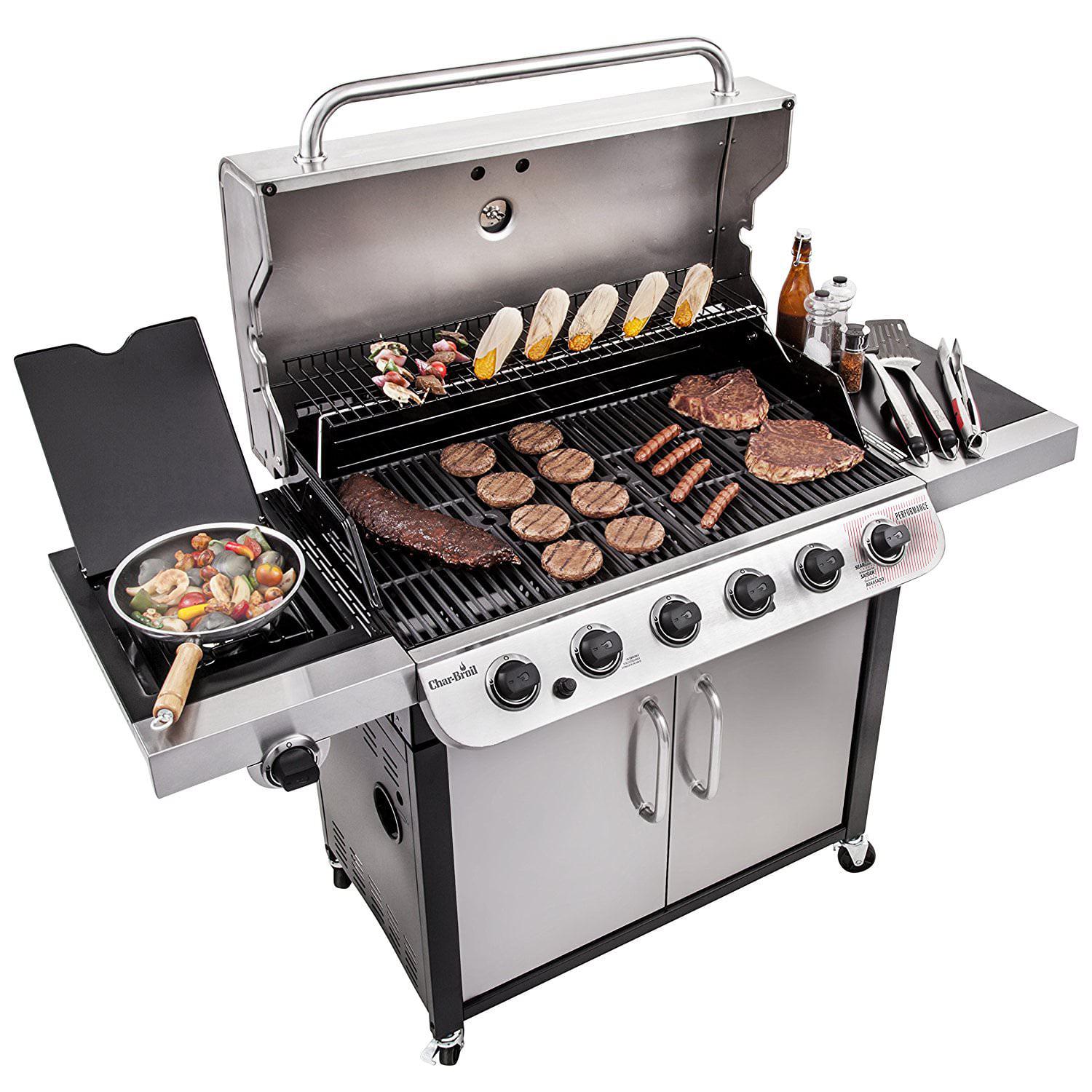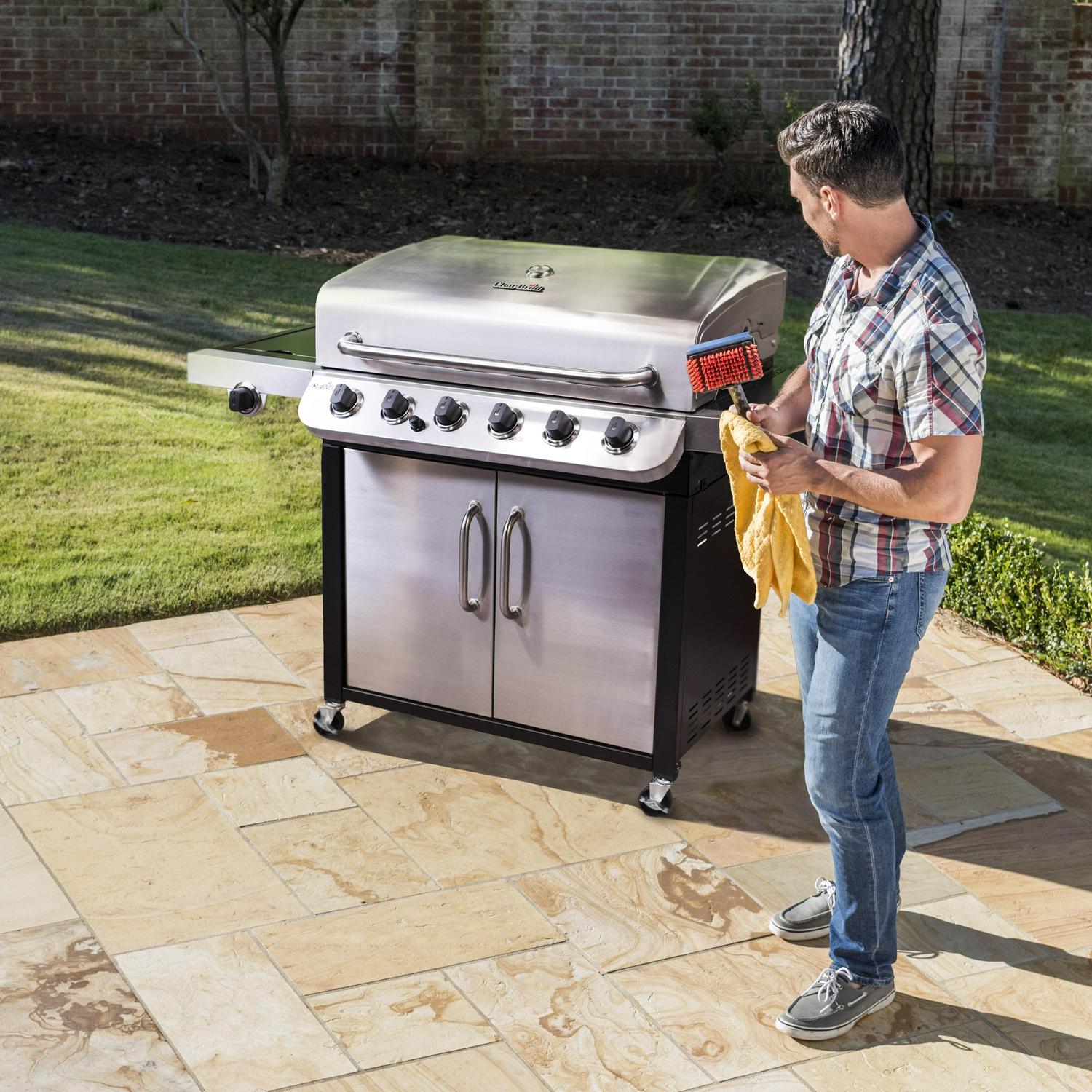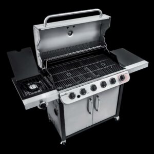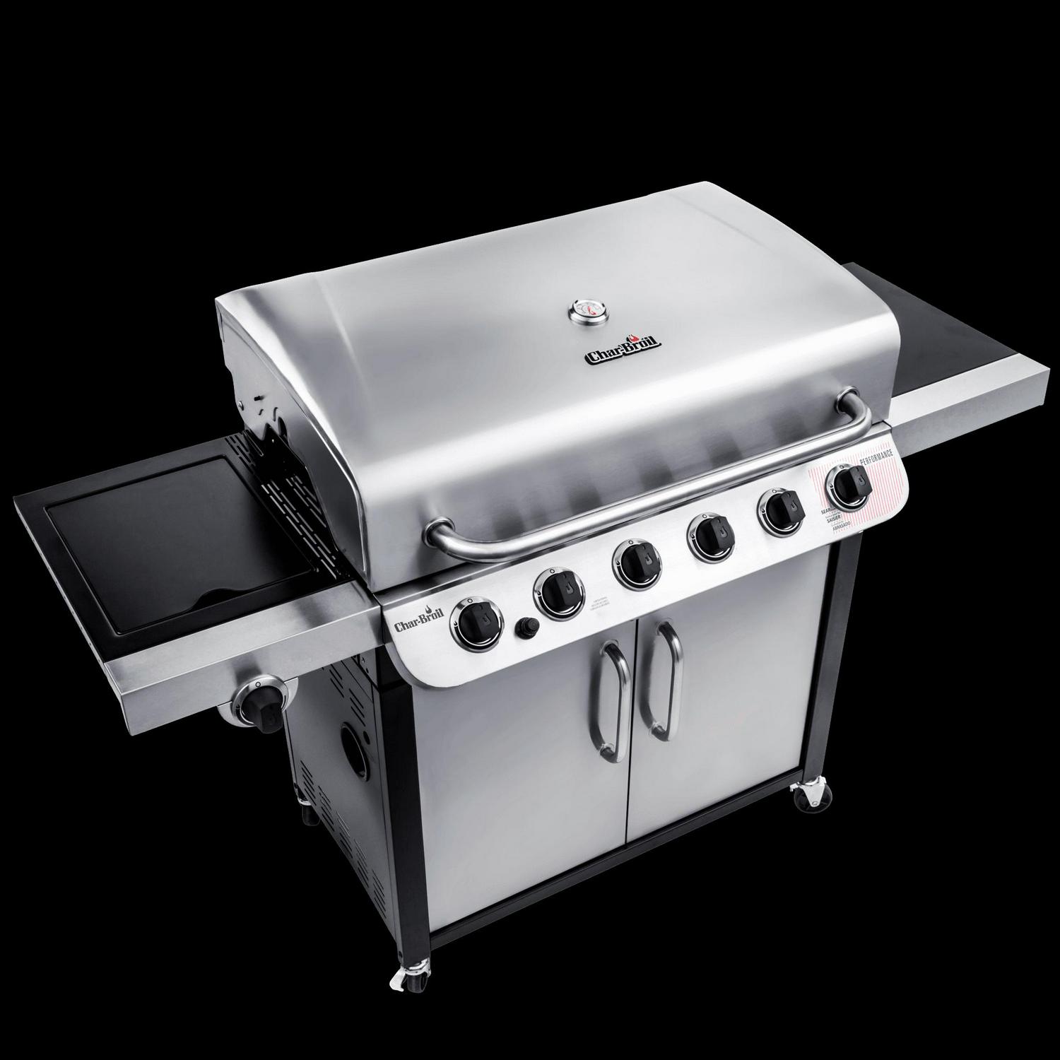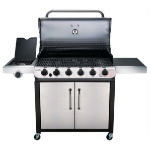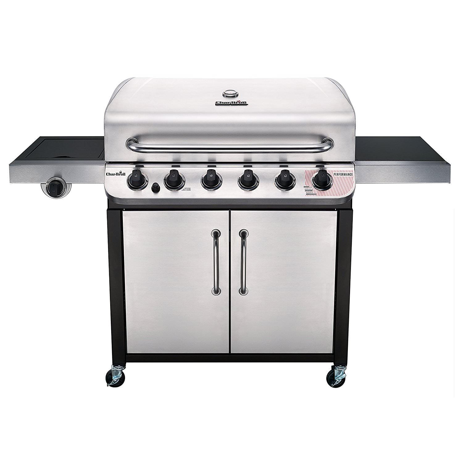 The Char-Broil performance series 6-burner liquid propane gas grill with side burner packs a ton of grilling features into a sleek stainless steel cabinet design. This grill is made to last, with porcelain-coated cast iron grates that are rust-resistant and easy to clean. All the features are here including a removable porcelain-coated grease pan, cabinet doors for storage, a 10,000 BTU side burner and a 15,000 BTU sear burner for locking in juices & grilling up flavorful steaks.