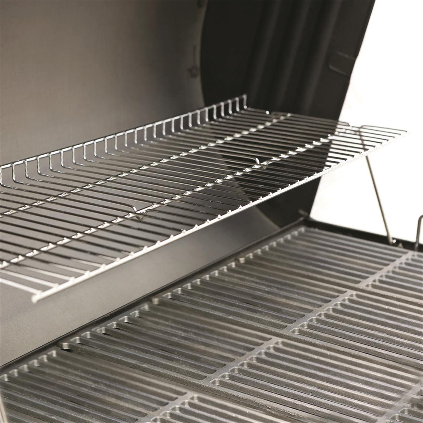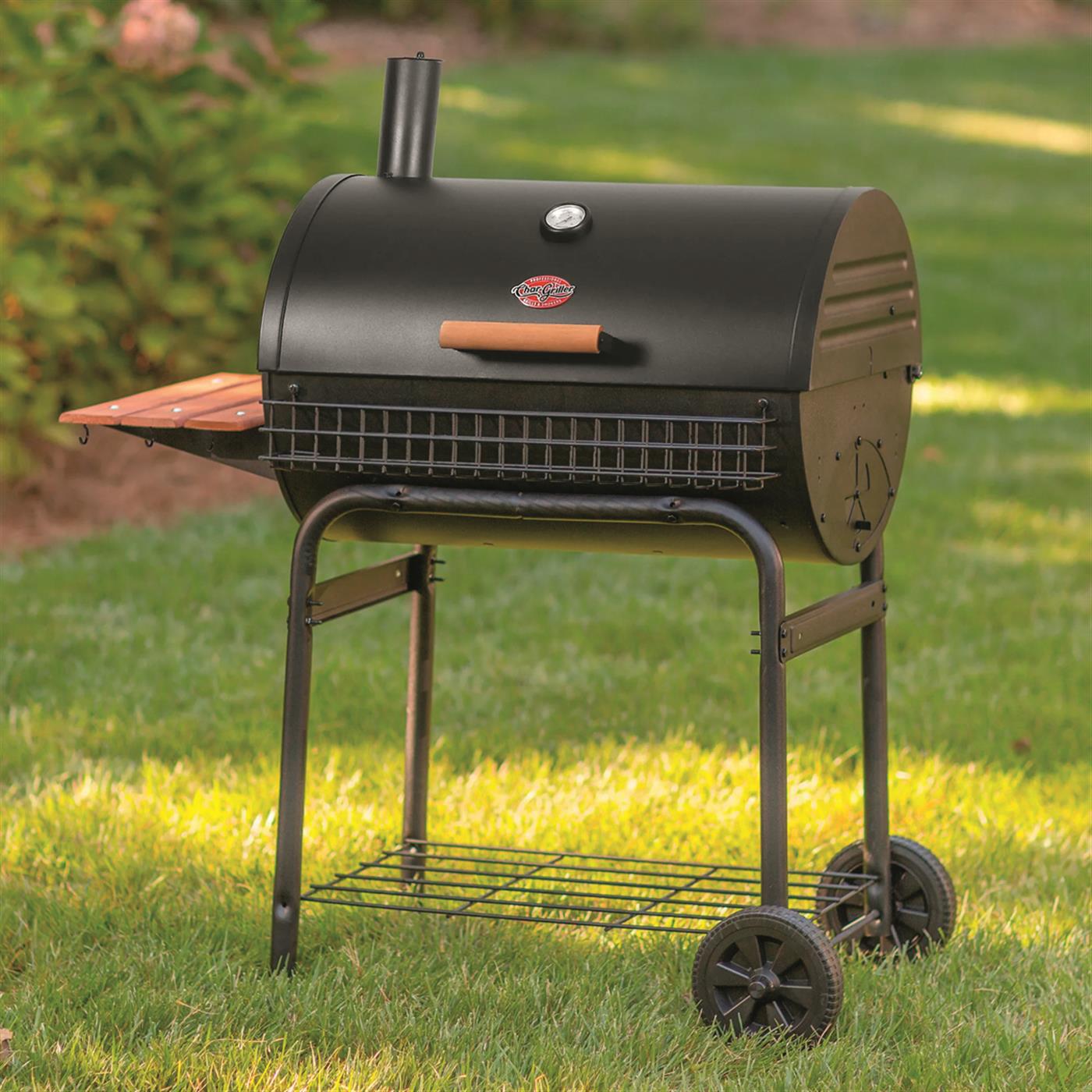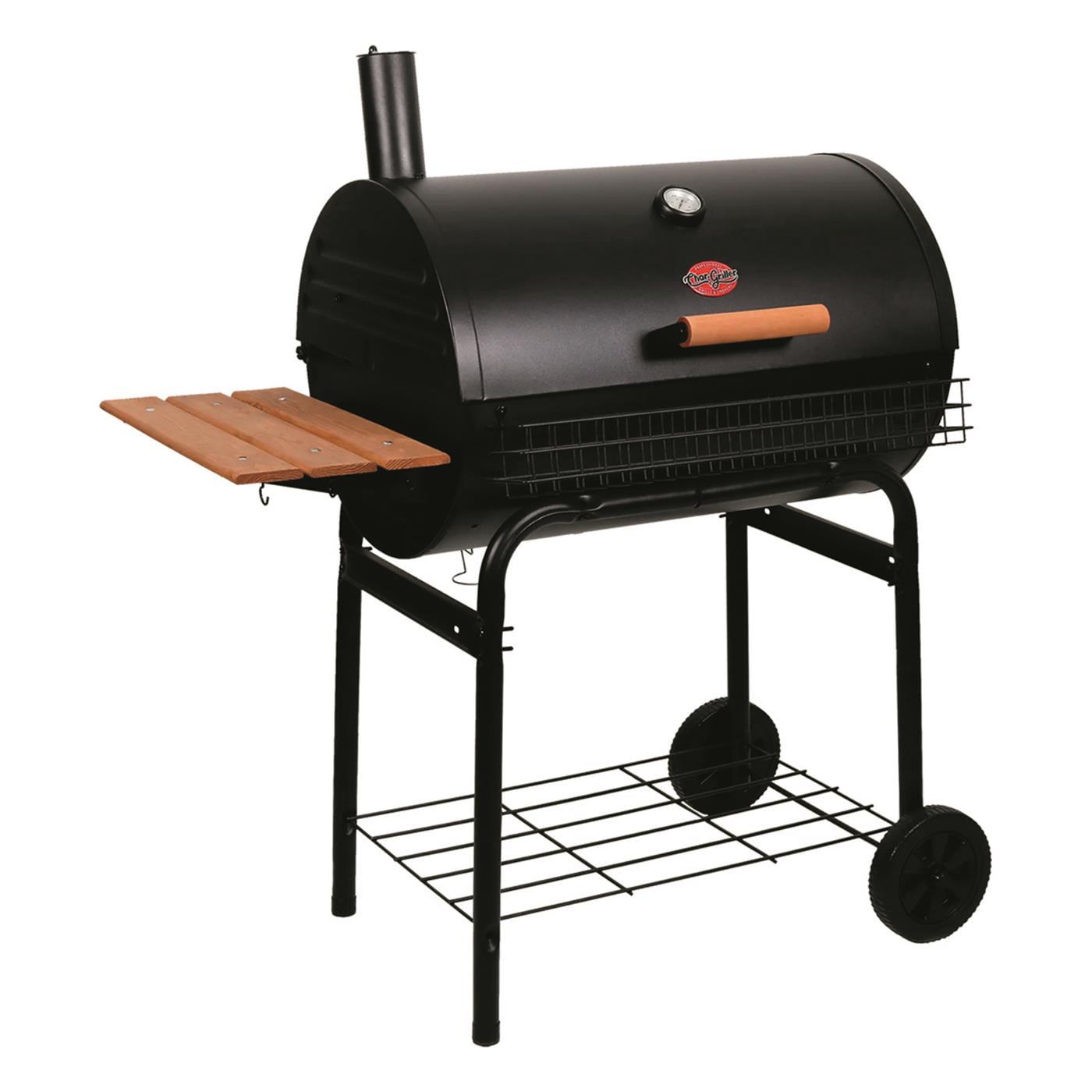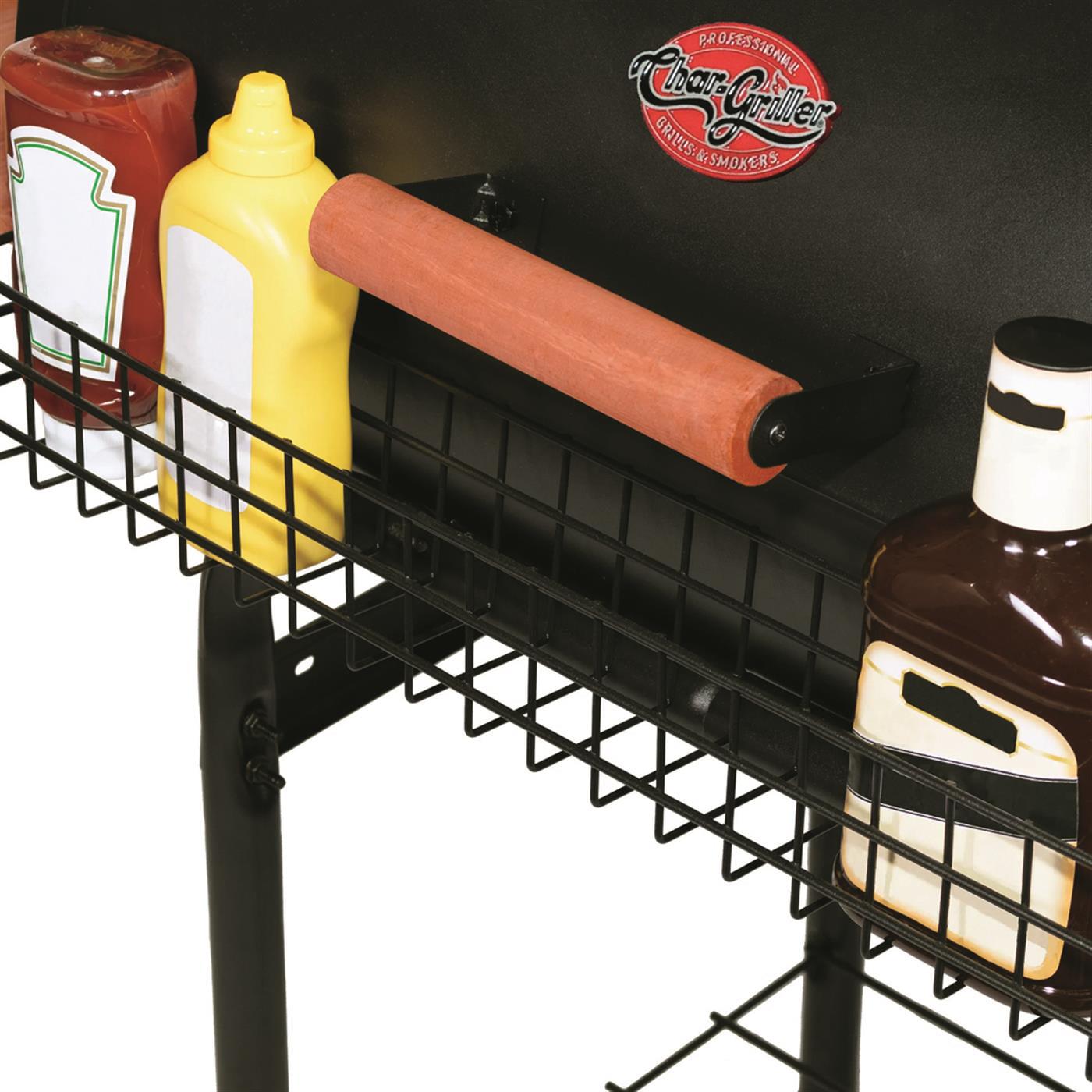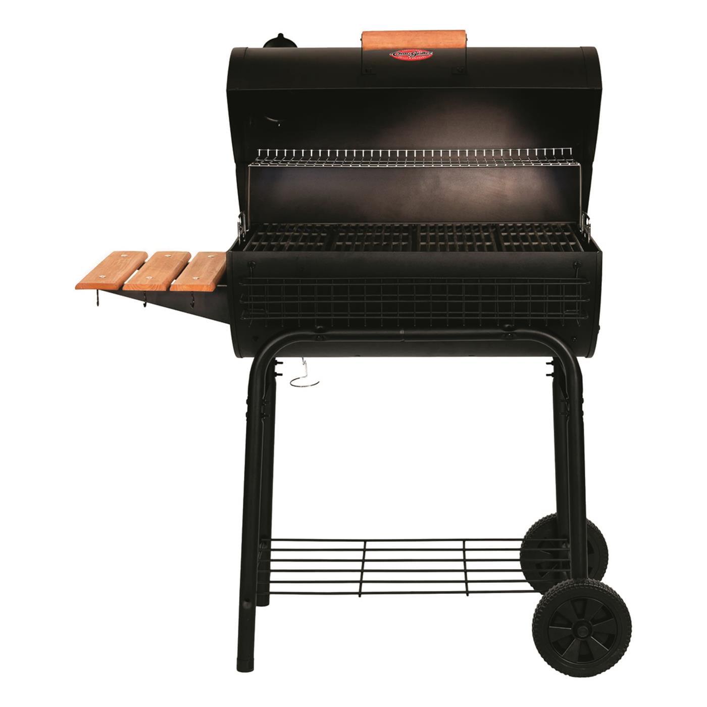 The grill of choice for professionals and back yard enthusiasts! The Char-Griller Deluxe Griller BBQ Grill provides 830 sq. in. of grilling capacity. Add the side fire box for great Texas style smoking. Warming Rack Cast iron cooking grates Heavy Steel Construction Adjustable Dampers Easy Dump Ash Pan Convenient Front Condiment Basket and Side Shelf Adjustable Fire Grate: Hot, Med, & Warm temperature control. Power coating. Double-bottom. Bottom Storage Rack. Heat Gauge. Rotisserie Adaptable (sold separately). Side Fire Box Adaptable (sold separately). Black.