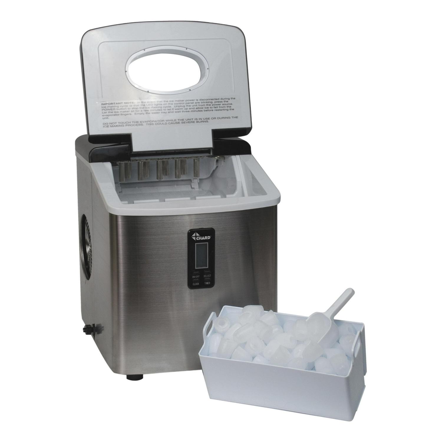 The Chard Ice Maker is durable portable and convenient. Unit has a high-quality stainless steel finish. It has easy-to-use soft-touch controls with LCD display monitoring. Makes up to 35 pounds of ice per day. Choose from three cube sizes: small, medium, or large. Features a convenient 19+ hour timer function. Makes first batch of ice in approximately six minutes. Unit has a built in reservoir drain, helpful cleaning reminder and includes a convenient ice scoop. High Quality Stainless Steel Finish Easy-to-use soft-touch controls with LCD display monitoring Makes up to 35 pound of ice per day Convenient 19+ hour timer functionMade in ChinaBrand: ChardIncluded items: Ice ScoopType: Ice MakerFinish: Stainless Steel Color options: Style: TraditionalSettings: Choose from three cube sizes: small, medium, or largeDisplay: LCD displayWattage: No listingCapacity: Storage Capacity: 10 lbModel: IM12SSDimensions: 14.5×11.7×14.21