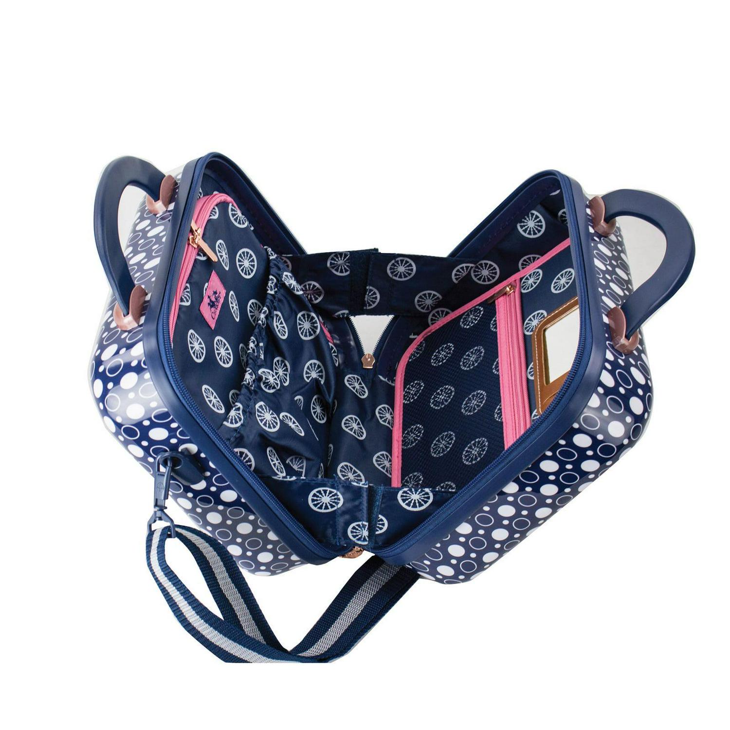 - Beauty case features vanity mirror, bag strap to attach to luggage, and detachable shoulder strap