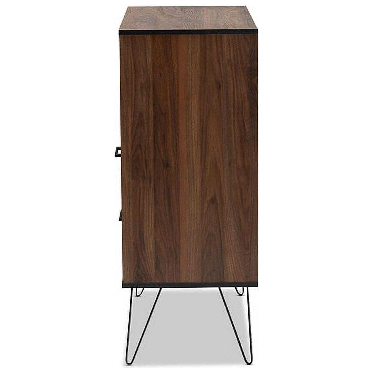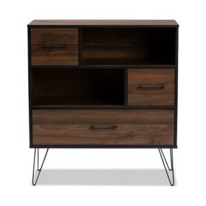 Charis Modern and Transitional Two-Tone Walnut Brown and Black Finished Wood 1-Drawer Bookcase Display your book collection in style with the Charis bookcase. This wood bookcase features clean lines and a two-tone walnut brown and black finish for chic, contemporary look. Two open shelves provide ample space to display all your favorite novels and knick-knacks. Two compartments behind doors and one drawer provide additional storage space. Long black handles add a modern touch, while black hairpin legs lend a light, airy feel. The Charis bookcase is made in Malaysia and requires assembly.