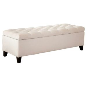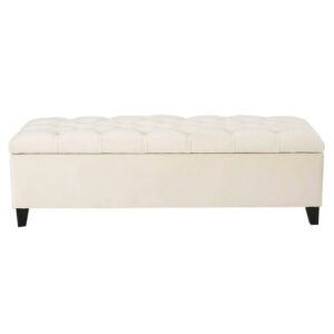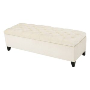 Thick, plush tufting lends lofty texture to the top of the Oliver New Velvet Storage Ottoman. Designed for use as comfortable, additional seating or the ideal footrest, this velvet-upholstered, rectangular ottoman is the perfect accent to your home’s décor. Neutrally hued in light beige, it can be used in any room and features a hinged lid for easy access to the spacious interior. Keep clutter to a minimum by storing books, blankets, extra pillows, movies, games, and more inside this substantially sized storage ottoman that’s solidly crafted with a birch wood frame and legs.