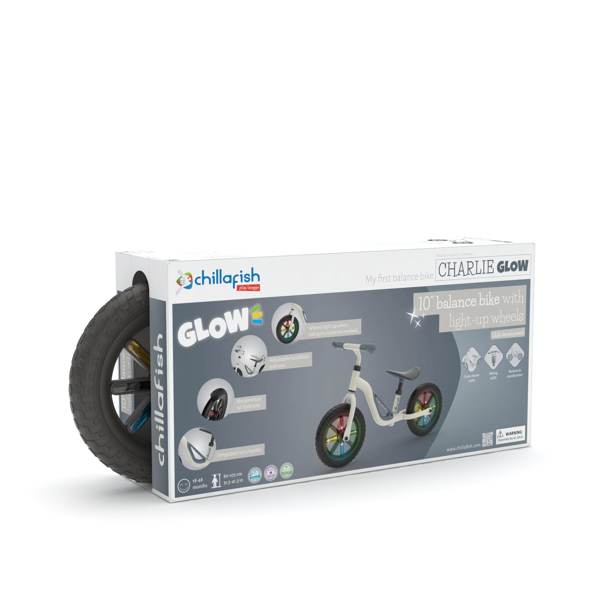 Chillafish Charlie Glow is a hyper lightweight 10″ balance trainer with integrated light-up wheels when riding for extra fun and visibility. The LED lights in the wheels don’t need any batteries, they are simply powered by riding the Charlie Glow – the faster you go, the harder they glow! This balance bike has puncture-proof tires and a high-quality metal frame weighing only 5,5 lbs / 2,5 kg. The perfect toy to train your toddler gross motor skills, balance and steering. The custom molded comfort seat and handlebar are easily adjustable in height. The seat is adjustable from 11-14,6 inch / 28-37 cm and the handlebar can adjust from 18,9-20,1 inch / 48-51 cm. Thanks to its lightweight frame your toddler can easily control the bike and, in combination with the integrated carry handle, it makes it easy for us parents to carry it as well. The light-up wheels are an extra fun factor and provide extra visibility when riding. The no-puncture 10-inch EVA tires are really comfortable: no need to inflate the tires anymore, no puncture risk, from now on only fun! Charlie Glow comes in 3 stylish colors, so there’s a style for every child. Integrating high-quality design in a very lightweight and intuitive product at very sharp pricing, Charlie Glow for sure is the best value for money balance bike you’ll find. Years of fun and skills to train! Charlie Glow balance bike will teach your kids to ride a real bicycle in no time! Recommended age: 18-48 months Recommended kids height: 31,5-41,3 inch / 80-105 cm