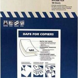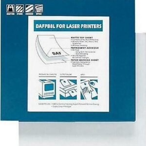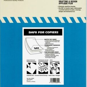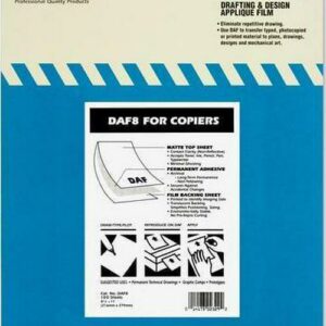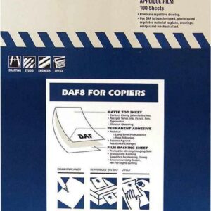 Chartpak 8.5″ x 11″ Matte Film, self-adhesive, transparent matte Mylar film disappears when applied, making it copy well in Diazo process. Use for presentations, comps/prototypes, and vellum drawings. Each sheet is curl-resistant and will lay flat when feeding through laser printers and copy machines. 8½” x 11″, 100-sheet pack.