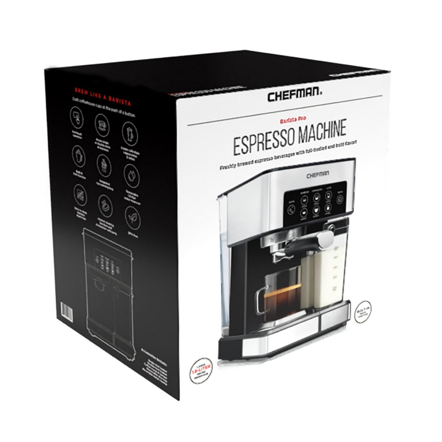 Ready to brew like a barista Craft the boldest, most flavorful coffeehouse brews right on your countertop with the Chefman Barista Pro Espresso Machine. Crush your caffeine cravings with strong single or double shot options and presets for artisanal cappuccinos and lattes! This 6-in-1, game-changing espresso machine makes your morning coffee worth celebrating. Skip the trip to your coffee shop and whip up 5-star sips in your own kitchen. With a powerful 15-bar pump and built-in milk frother, you can effortlessly brew and put the perfect finishing touch on your favorite beverages. It s time to uncomplicate your morning coffee. Seamless one-touch operation allows you to pick your preset, froth to perfection, and brew faster than ever. With a family-sized 1.8-liter water container, you can whip up coffee for a crowd and not have to worry about constant re-filling! We also make cleanup as simple as brewing. With a built-in internal cleaning function, you can push a button, sit back, and sip. The sleek, stainless steel exterior cleans with a quick wipe down of a damp cloth, and all detachable parts are dishwasher-safe and BPA-free for a convenient and safe start-to-finish process. Chefman has you covered. With a 1-year assurance, you can purchase and cook worry-free. This product is CETL- approved with advanced safety technology for long-lasting durability. New, full color box. 1350 Watts/120 Volts, 10.58 lbs RJ54-V2 NEW