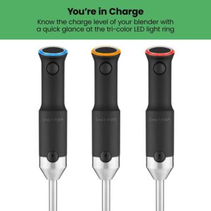 – CHARGE INDICATORS: The colorful LED light ring illuminates three different colors to notify you when fully charged, getting low, and when it s time to plug in, so you aren t left without power mid-blend. Once fully charged, it can hold a charge for up to a year before use.