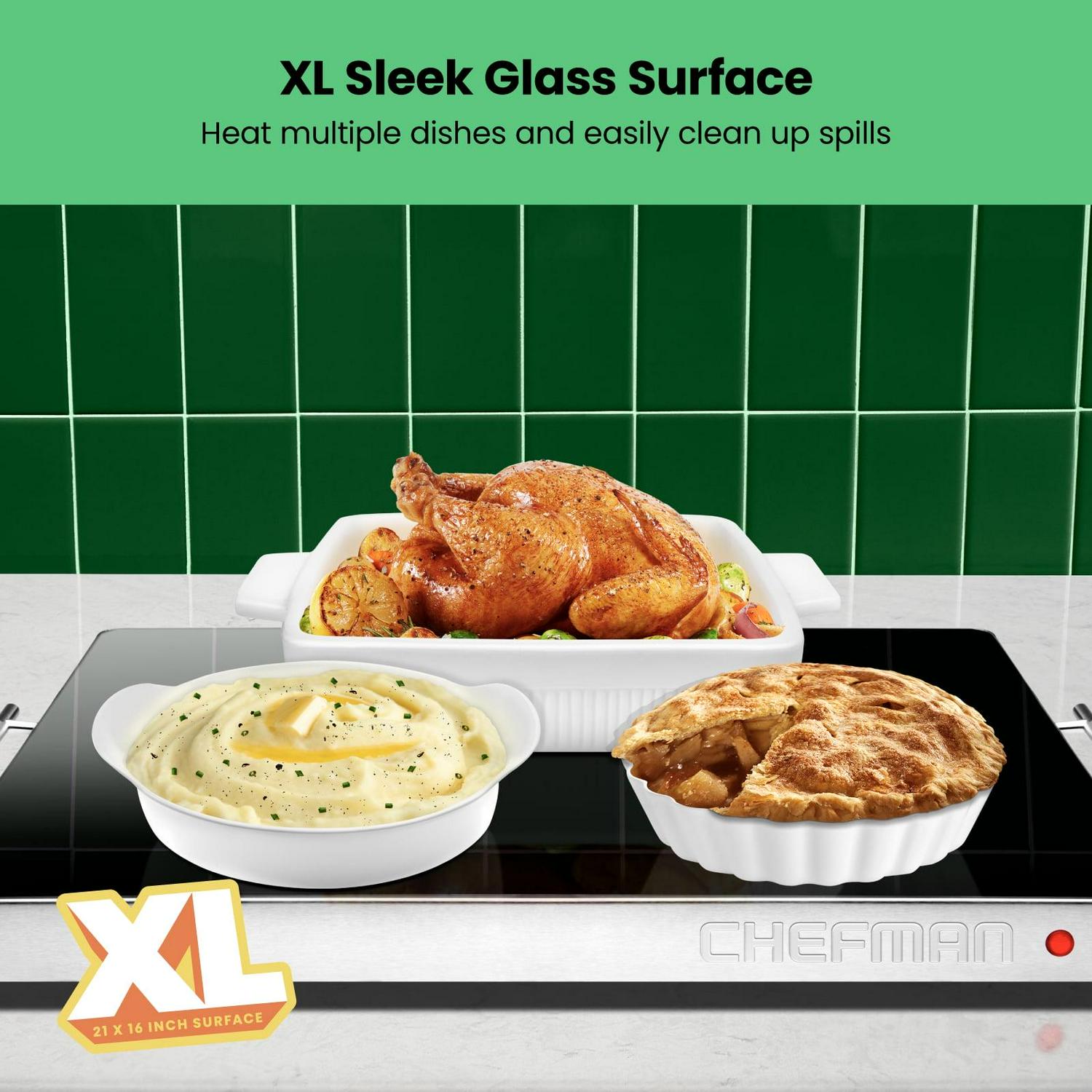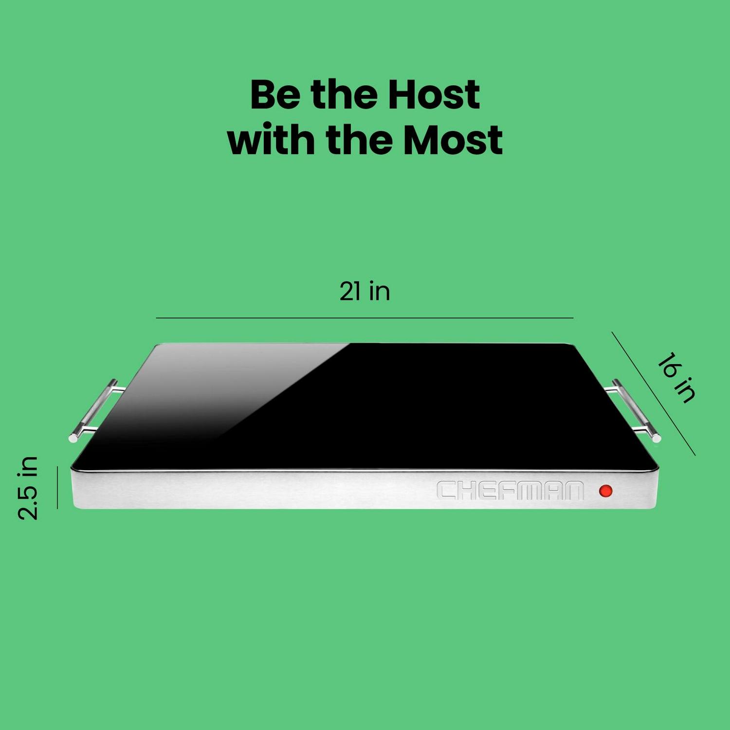 Chefman Electric Warming Tray w/ Temp Control, 21 x 16 , Stainless Steel w/ Glass Top – New