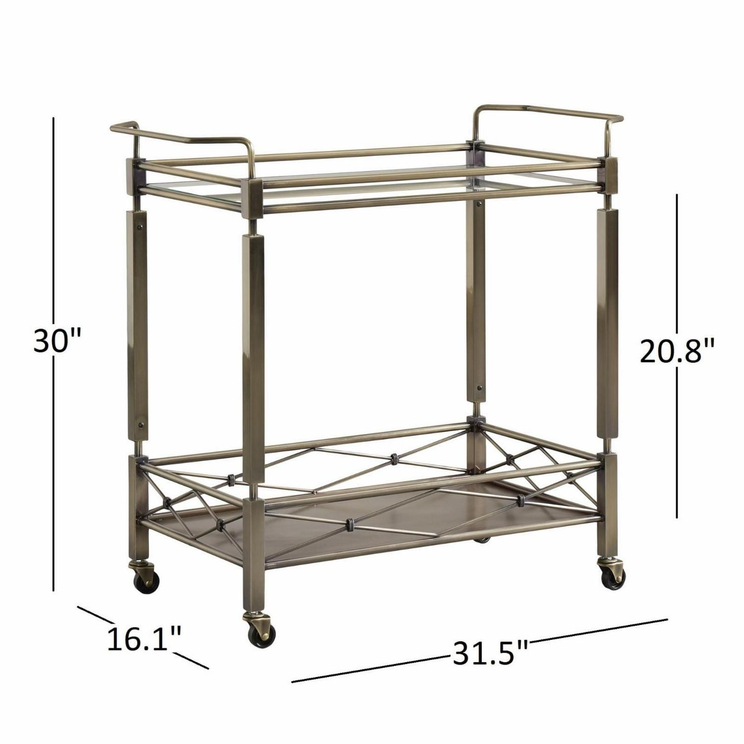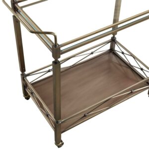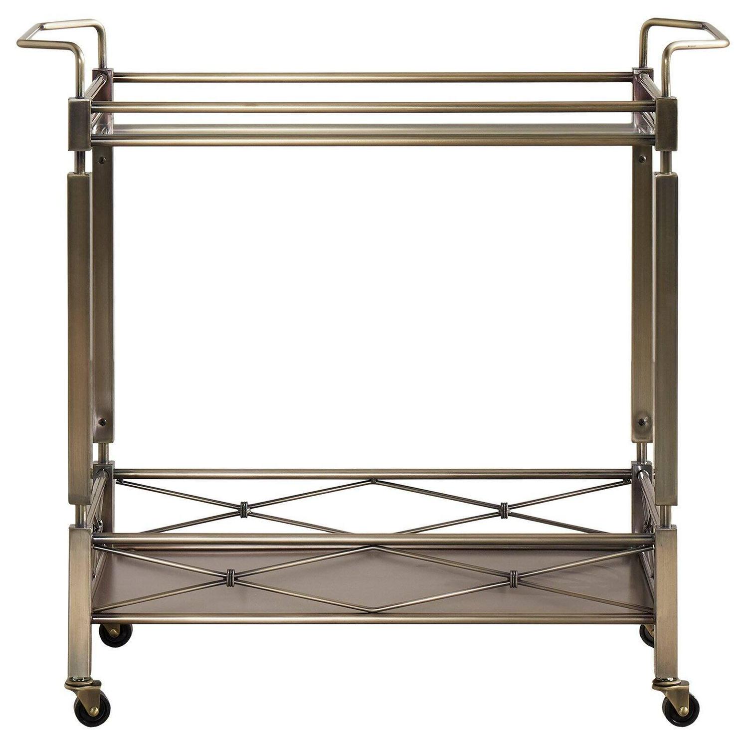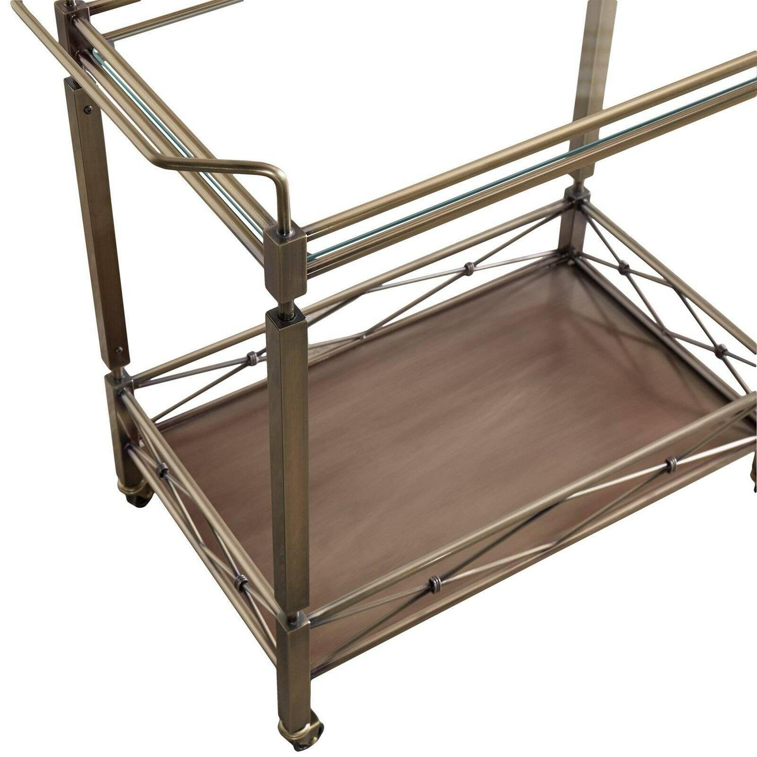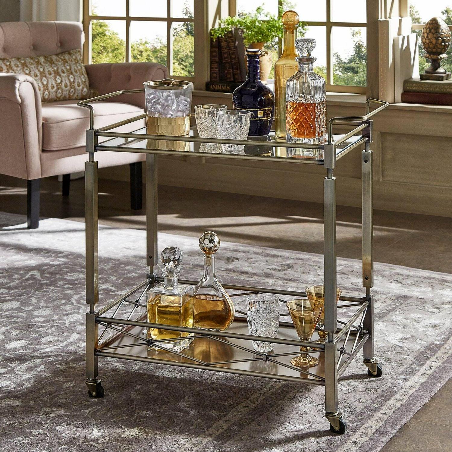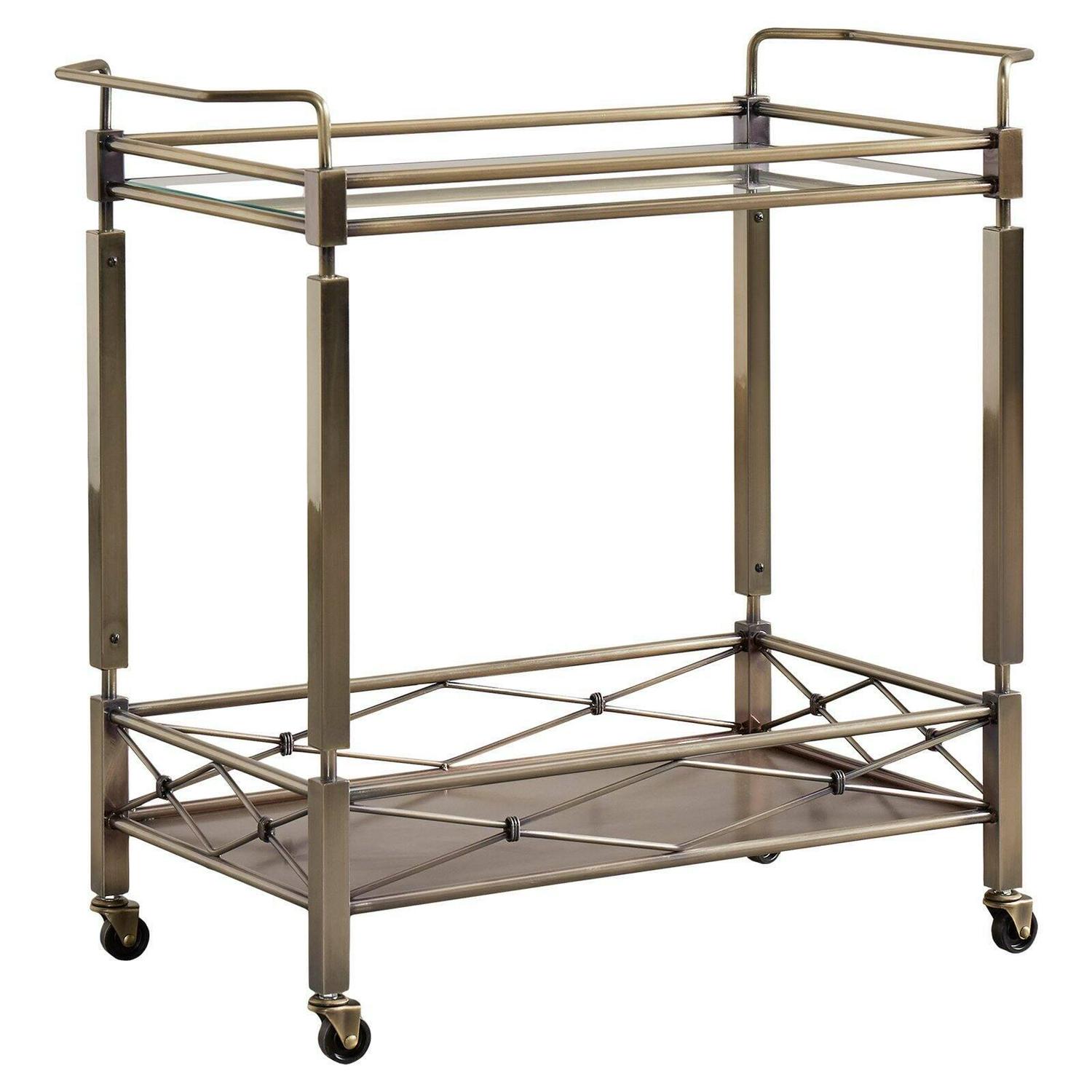 Showcasing an antique brass finish and a crisscross gallery rail, the Chelsea Lane Clear Tempered Glass Metal Bar Cart has all the visual appeal of a genuine vintage piece. Clear, tempered glass shines along the top and handy lower shelf, enhancing the elegance of the cart with its reflective shine. Handles are positioned at both ends of the durable metal bar cart for easy steering. Some assembly required.