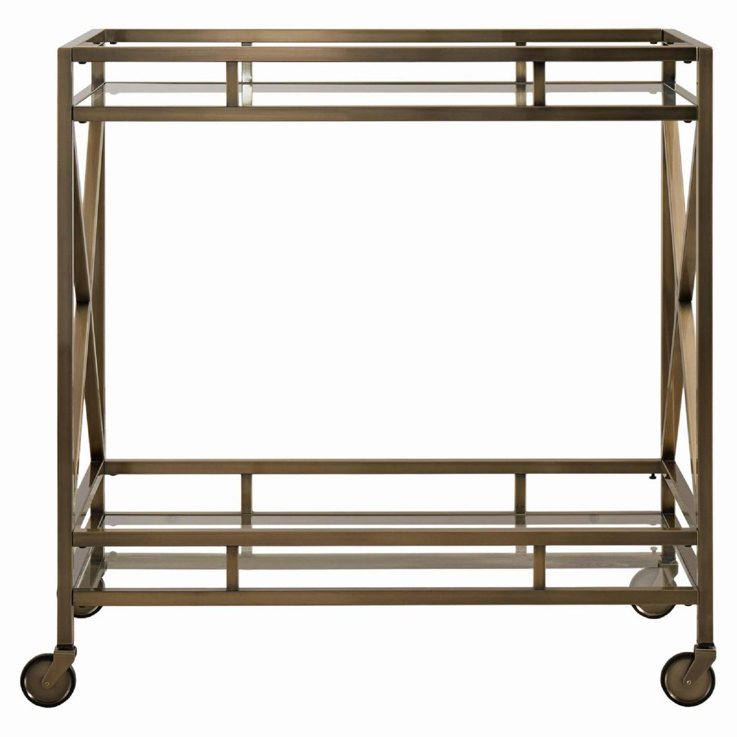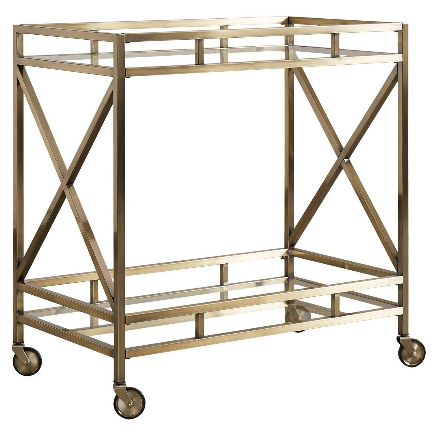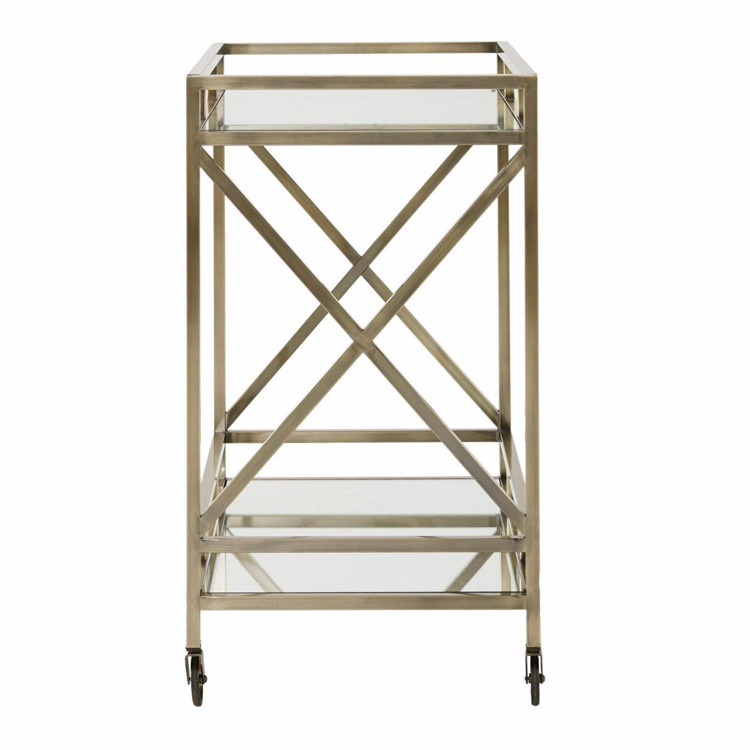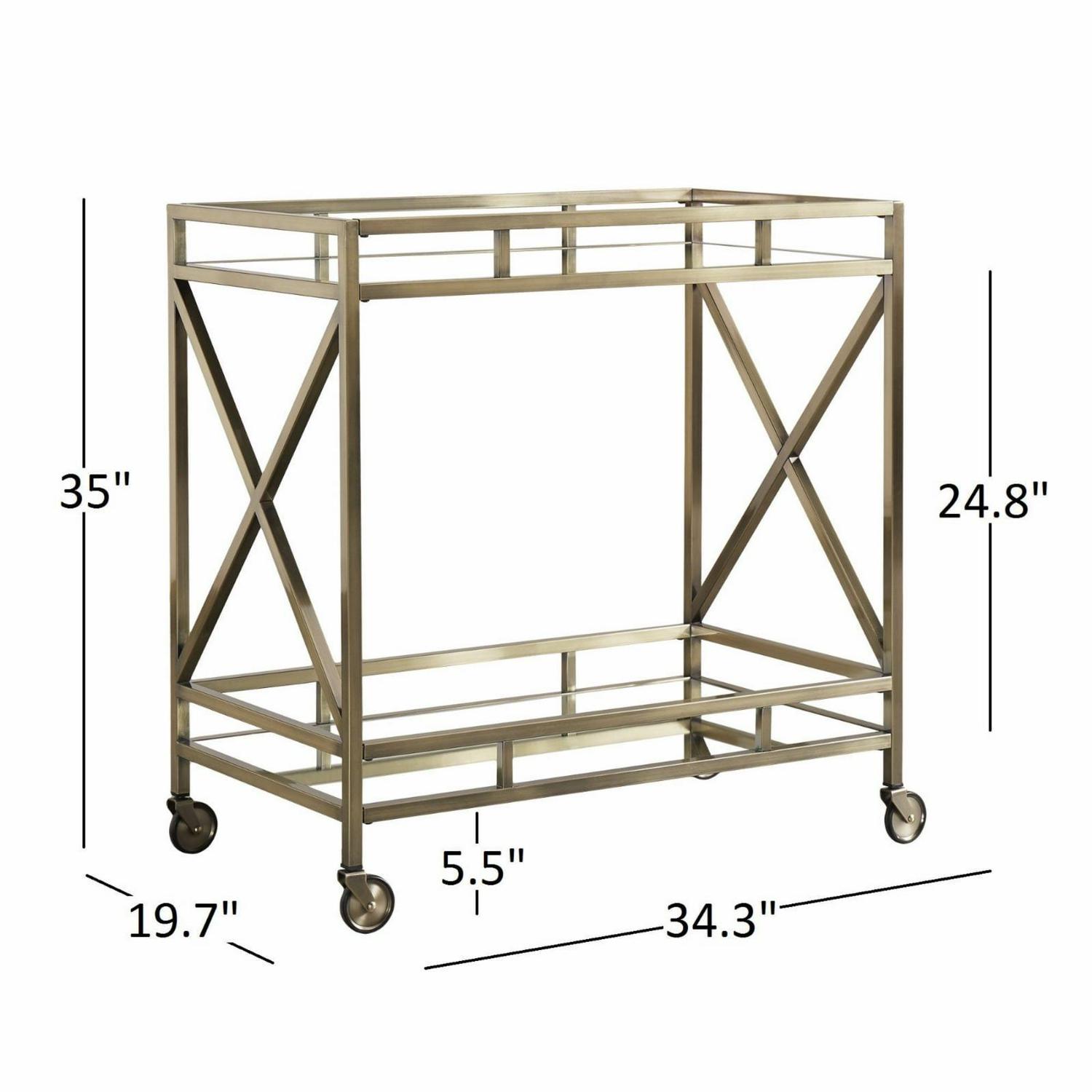 Make your bar area shine with the Chelsea Lane Mirrored Glass Metal Bar Cart. Mirrors reflect the light along the top and bottom of this vintage-inspired antique brass-finished metal bar cart. Gallery rails surround both levels of the piece, ensuring that your glasses, bottles, and tools stay securely in place while in transit. Some assembly required.