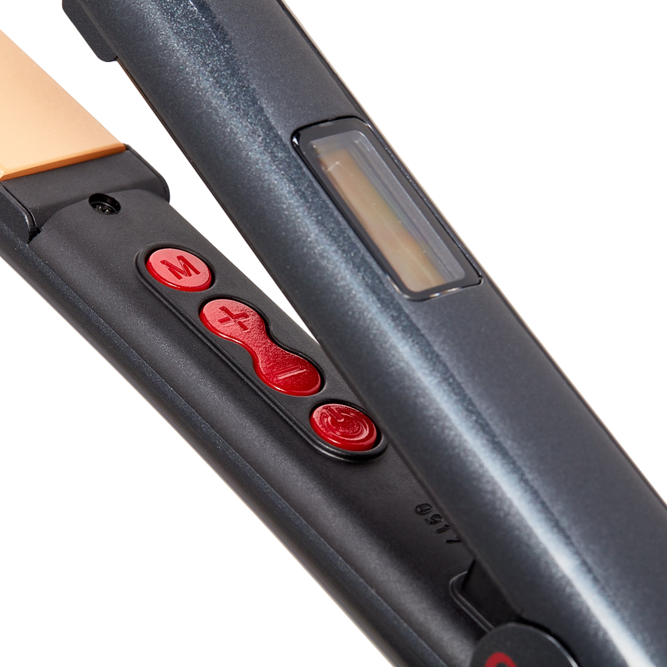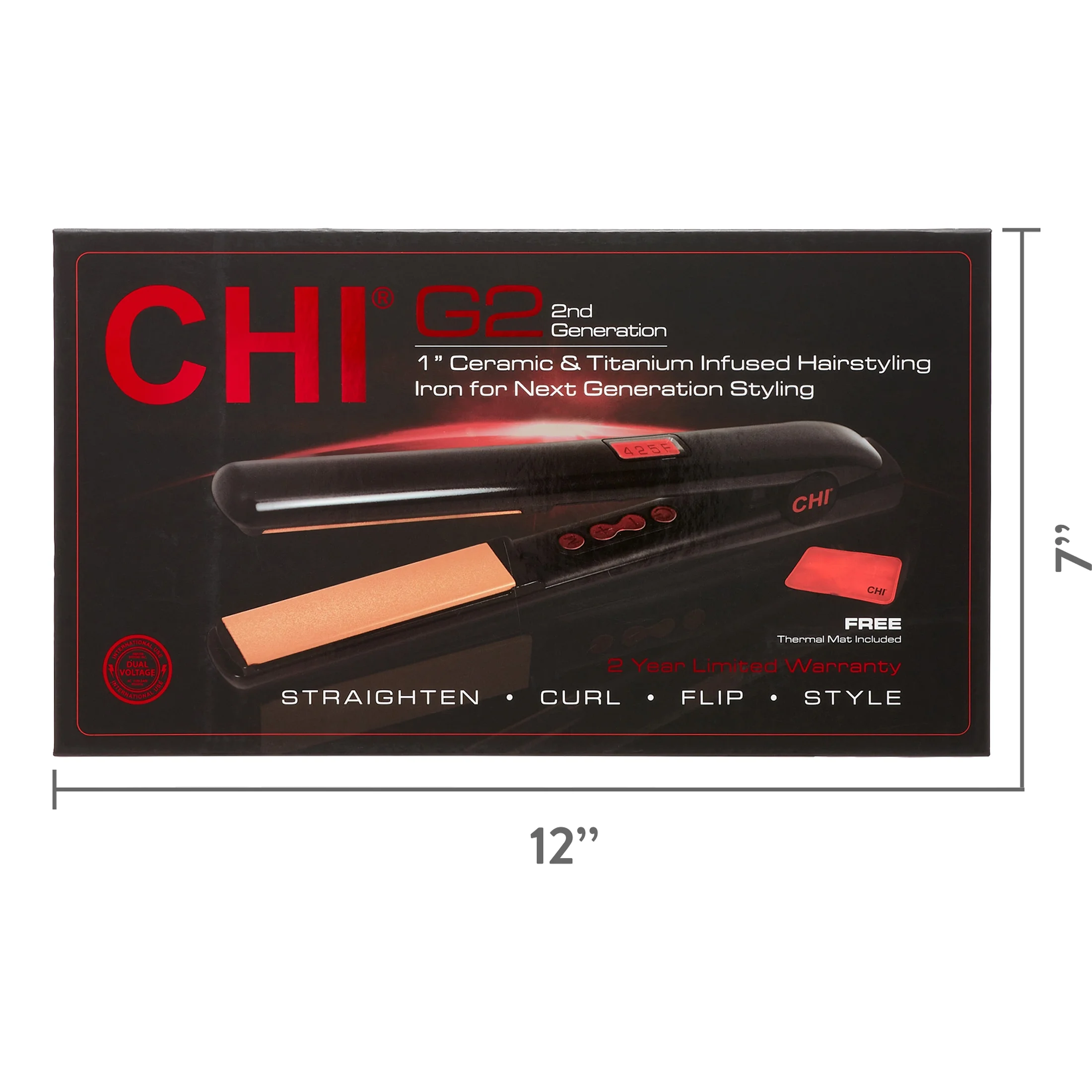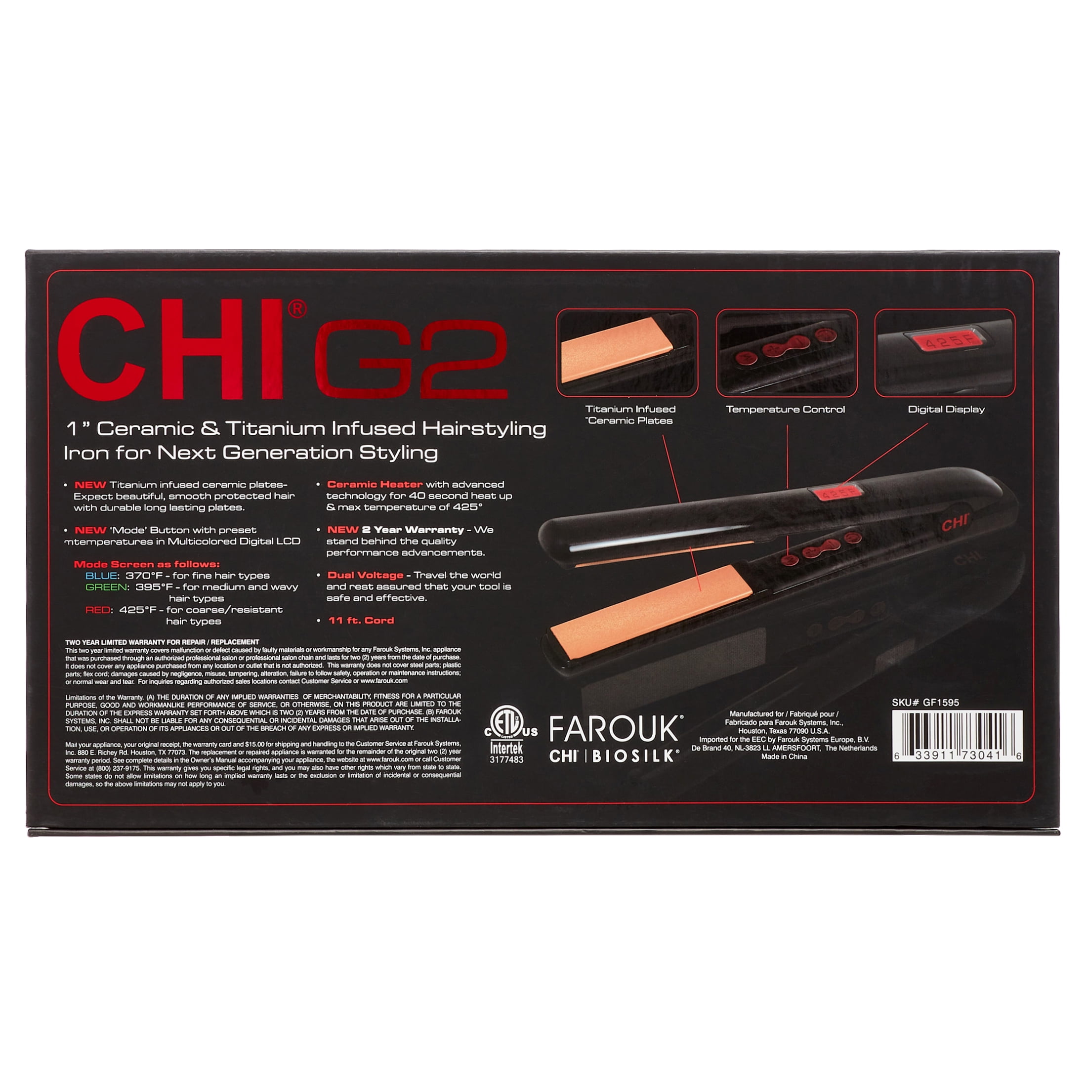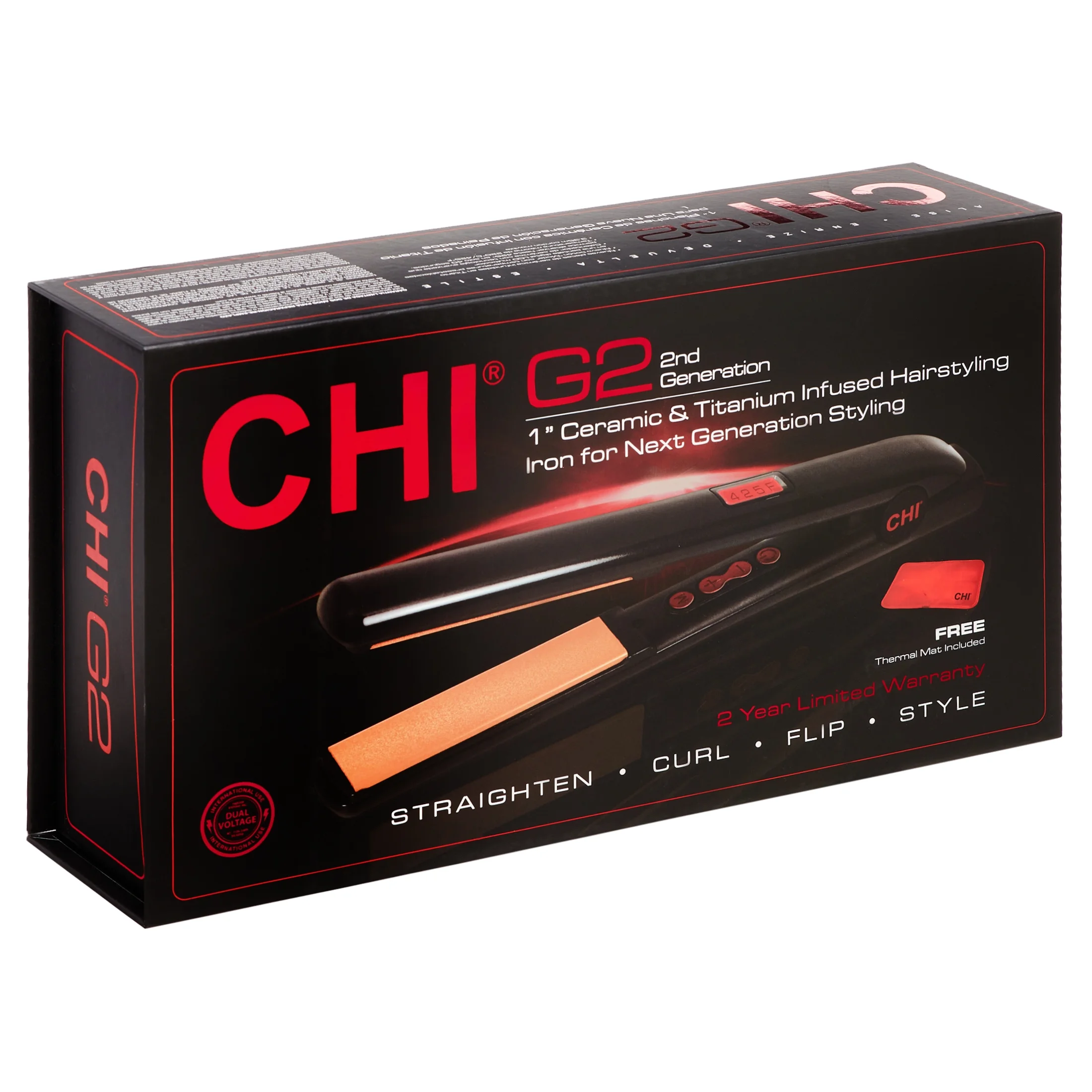 The dynamic CHI G2 Professional Flat Iron offers a sleek design, upgraded technology and outstanding performance. The CHI G2 features titanium-infused ceramic plates for added durability and an even smoother glide. Digital temperature reading displayed on a color-coded LCD screen allows for proper temperature setting for fine, medium, and coarse hair up to 425°F.