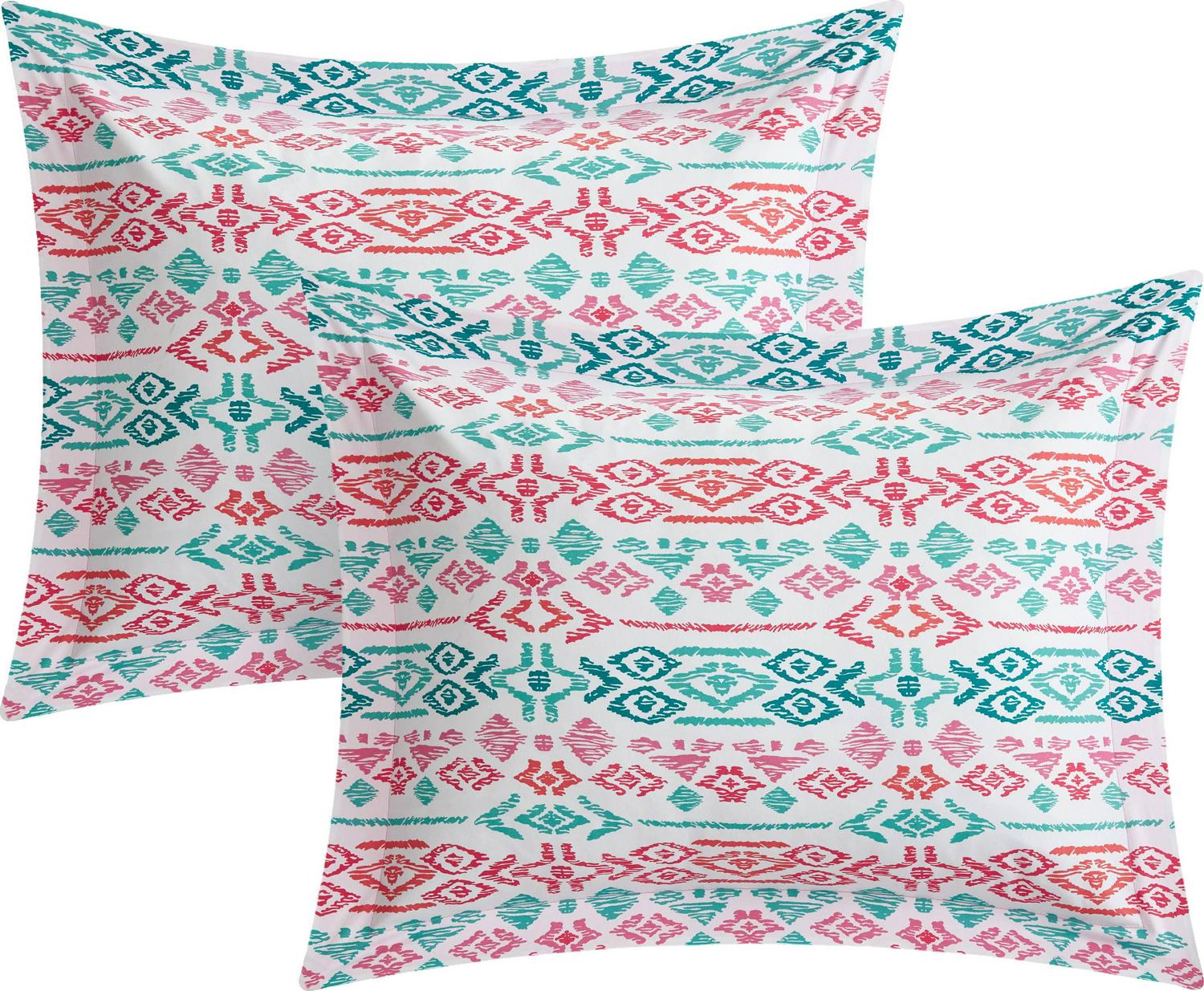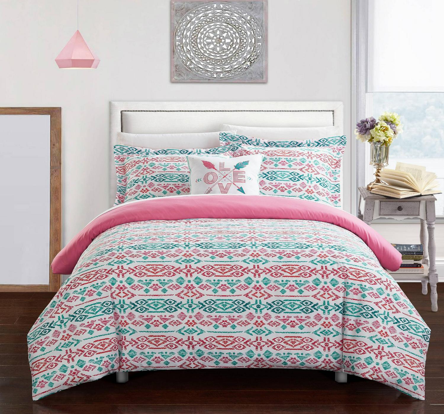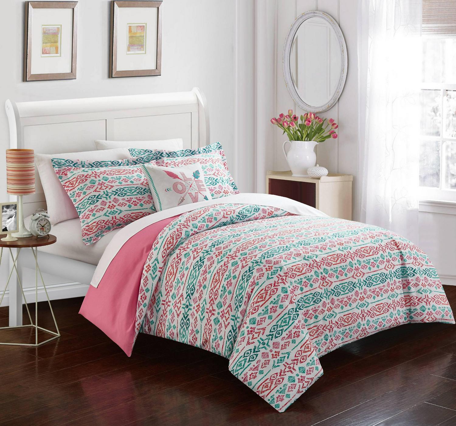 Designer bohemian inspired ikat bedding collection include everything you need and all the details to perfect that Boho Chic look. Bright and fun colors in aqua and rose tones make this the perfect bedroom decor. Trendy boho Love Pillow included to complete the look. Included is a complete 3 piece sheet set. Zipper closure for easy removal for convenient washing. Full Set includes: One (1) Duvet, Two (2) Shams, One (1) Dec Pillow, One (1) Flat Sheet, One (1) Fitted Sheet, Two (2) Pillow Case Twin X-Long/Twin Set includes: One (1) Duvet, One (1) Sham, One (1) Dec Pillow, One (1) Flat Sheet, One (1) Fitted Sheet, One (1) Pillow Case Style: Contemporary Fabric detail: Printed Pattern: Oriental Color: Aqua Material: Microfiber Care instructions: Dry clean preferred. Machine washable, use front loader machine (or top loader without agitator) to avoid tearing. Use Cold water in gentle cycle, tumble dry low heat, adding 2 tennis balls in the dryer will add fluffiness. Full dimensions: Duvet: 78×86 inches 2 Shams: 20×26+2 inches Dec Pillow: 18×18 inches Flat Sheet: 81×96+4 inches Fitted Sheet: 54×75+12 inches 2 Pillow Case: 20×30+4 inches Twin X-Long dimensions: Duvet: 66×90 inches Sham: 20×26+2 inches Dec Pillow: 18×18 inches Flat Sheet: 66×102+4 inches Fitted Sheet: 39×80+8 inches Pillow Case: 20×30+4 inches Twin dimensions: Duvet: 66×90 inches Sham: 20×26+2 inches Dec Pillow: 18×18 inches Flat Sheet: 66×96+4 inches Fitted Sheet: 39×75+8 inches Pillow Case: 20×30+4 inches The images we display have the most accurate color possible. However, due to differences in computer monitors, we cannot be responsible for variations in color between the actual product and your screen.