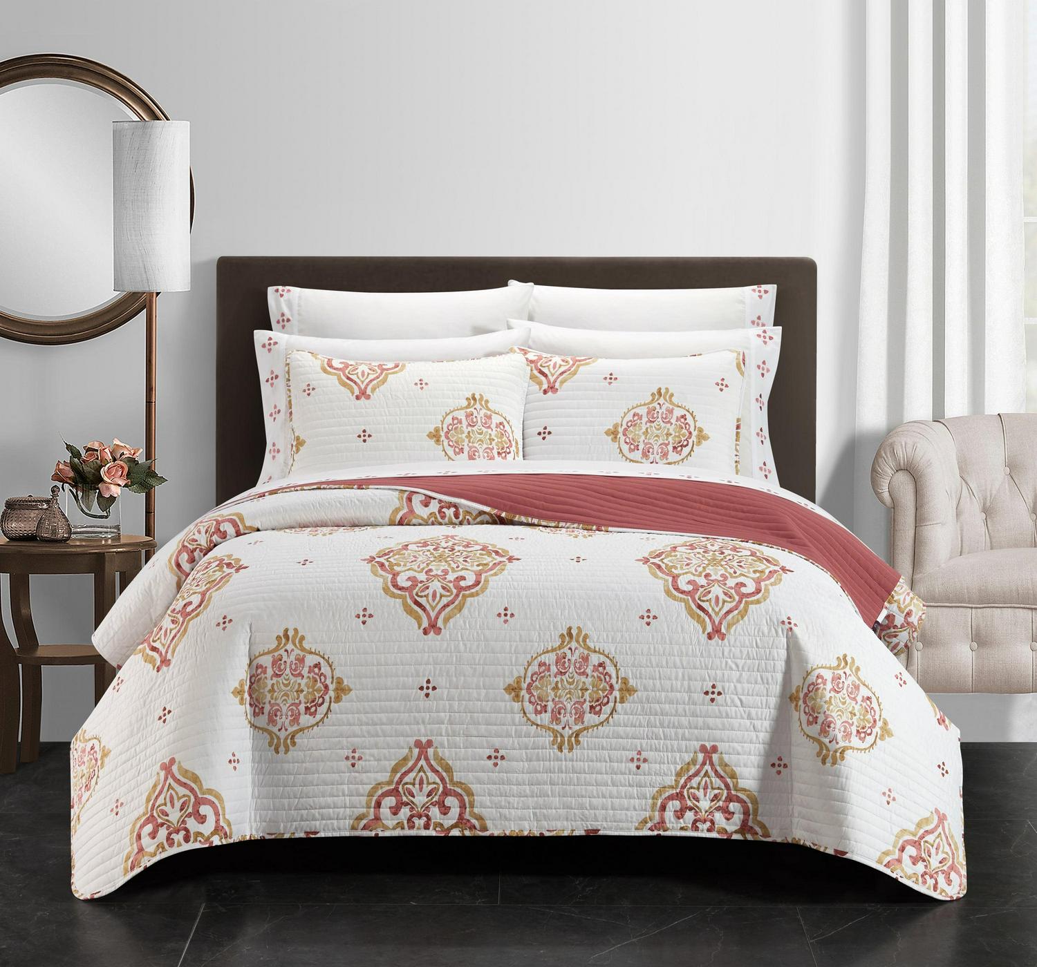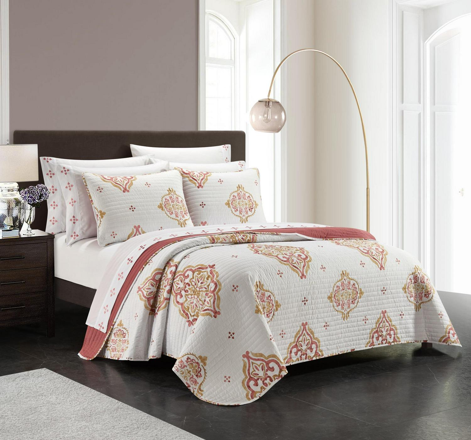 Chic Home Alpine 9-Piece Medallion Quilt Set, California King, Coral/Gold/White