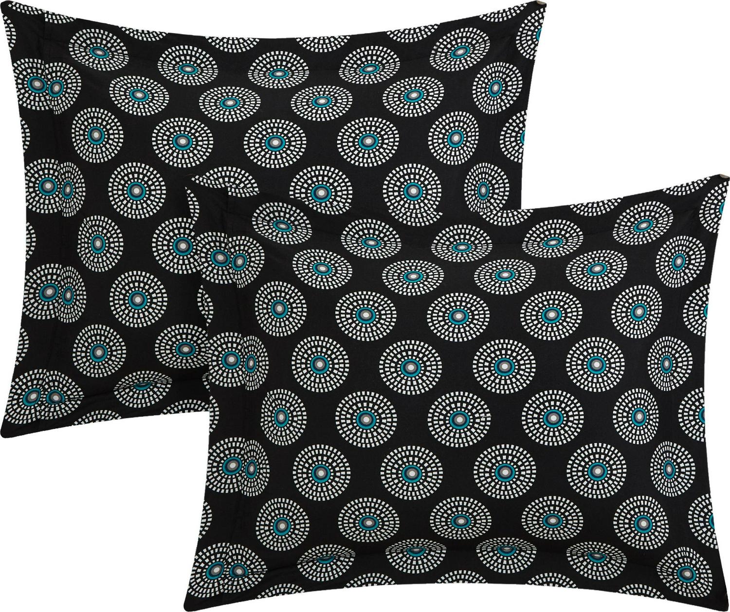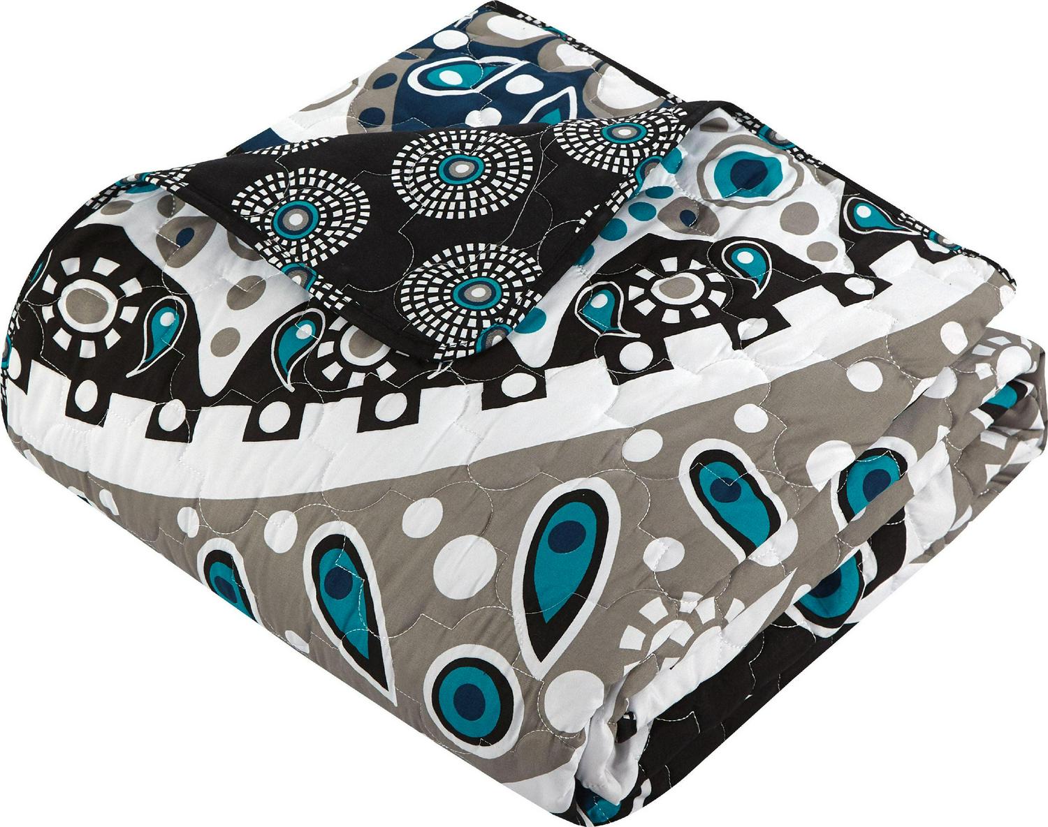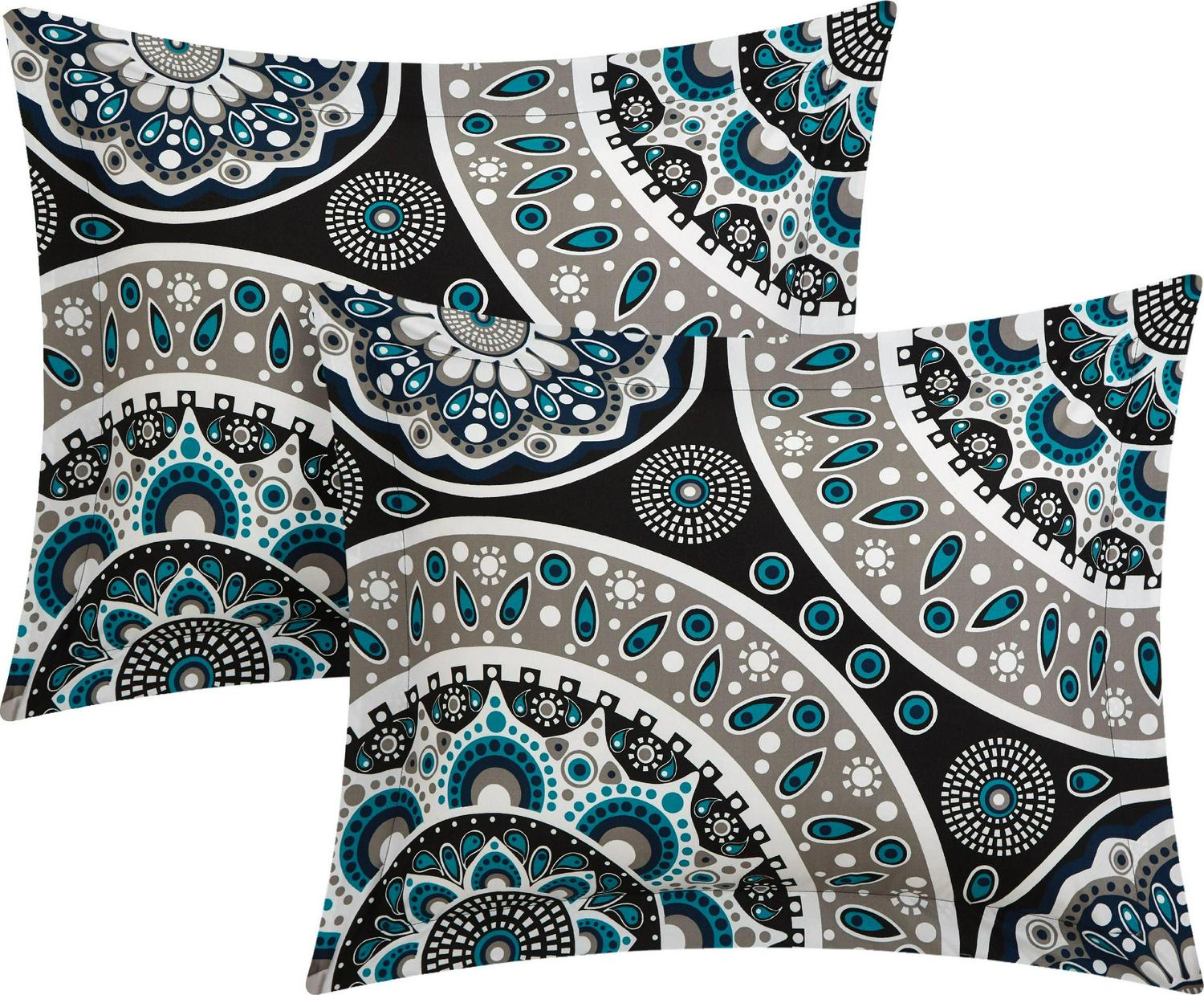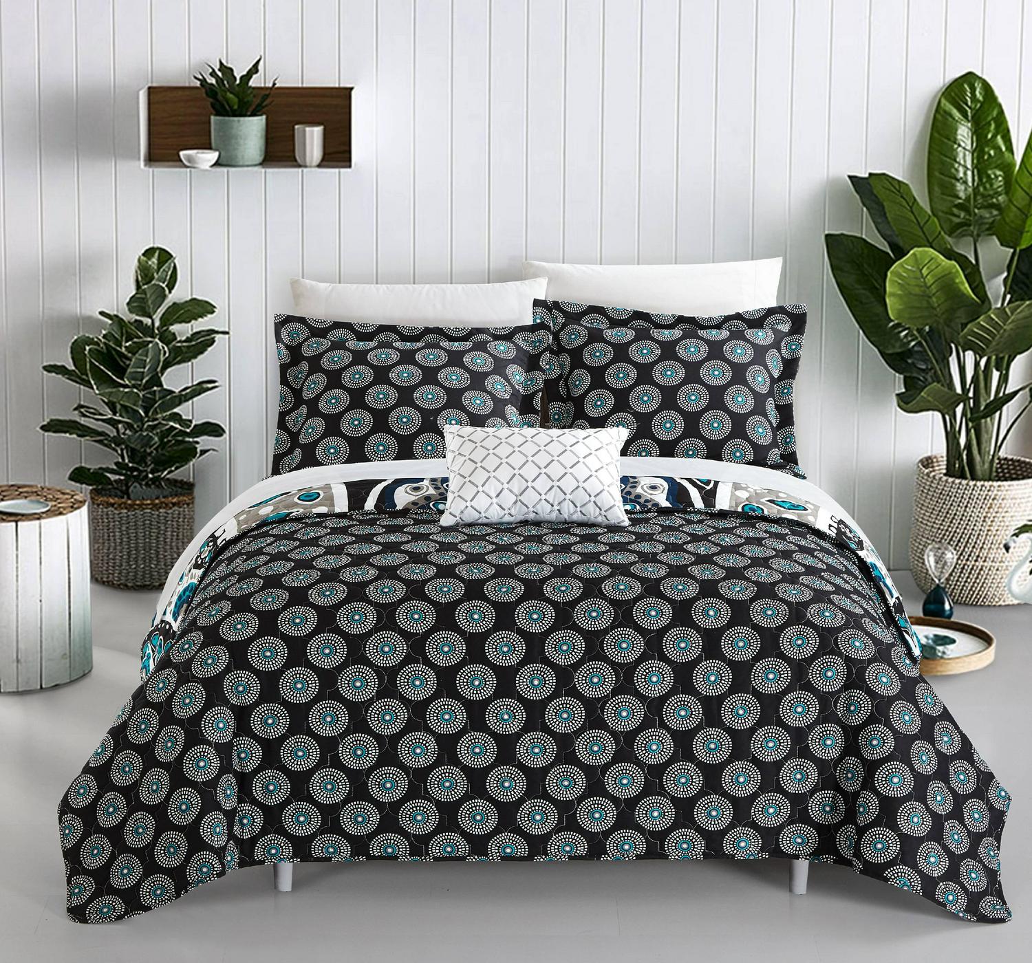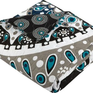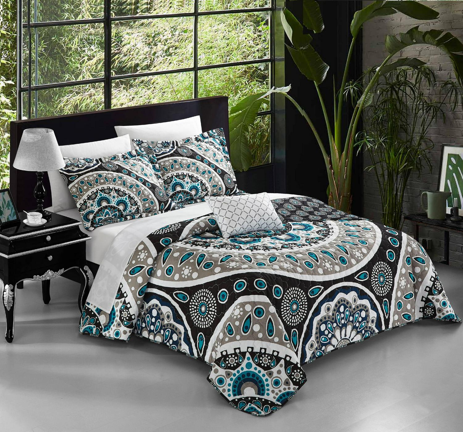Free your spirit with this amazing large scale Bohemian contempo globally inspired look. Quilting details and hints of black, grey, taupe and aqua blues, on black grounds truly compliment a true boho chic look. This set also is reversible to a contemporary design allowing you to change the look as per your mood. Included is an embroidered detailed embroidery decorative pillow to complete the look.