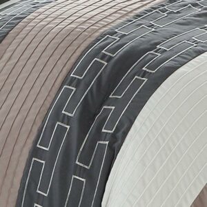 The fashion forward comforter set features a sophisticated stitched pattern in a color block theme. A bed skirt, design coordinated shams and deco pillows are included to complete the look. The set includes 1 comforter, 1 bed skirt, 2 shams, 2 decorative pillows. Color options black/burgundy/white, burgundy/grey/white, navy/almond, taupe/grey/tan. Care instructions dry clean preferred. Machine washable, use front loader machine (or top loader without agitator) to avoid tearing. Use Cold water in gentle cycle, tumble dry low heat, adding 2 tennis balls in the dryer will add fluffiness.