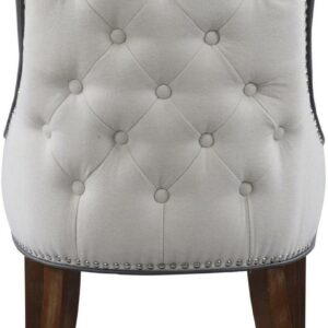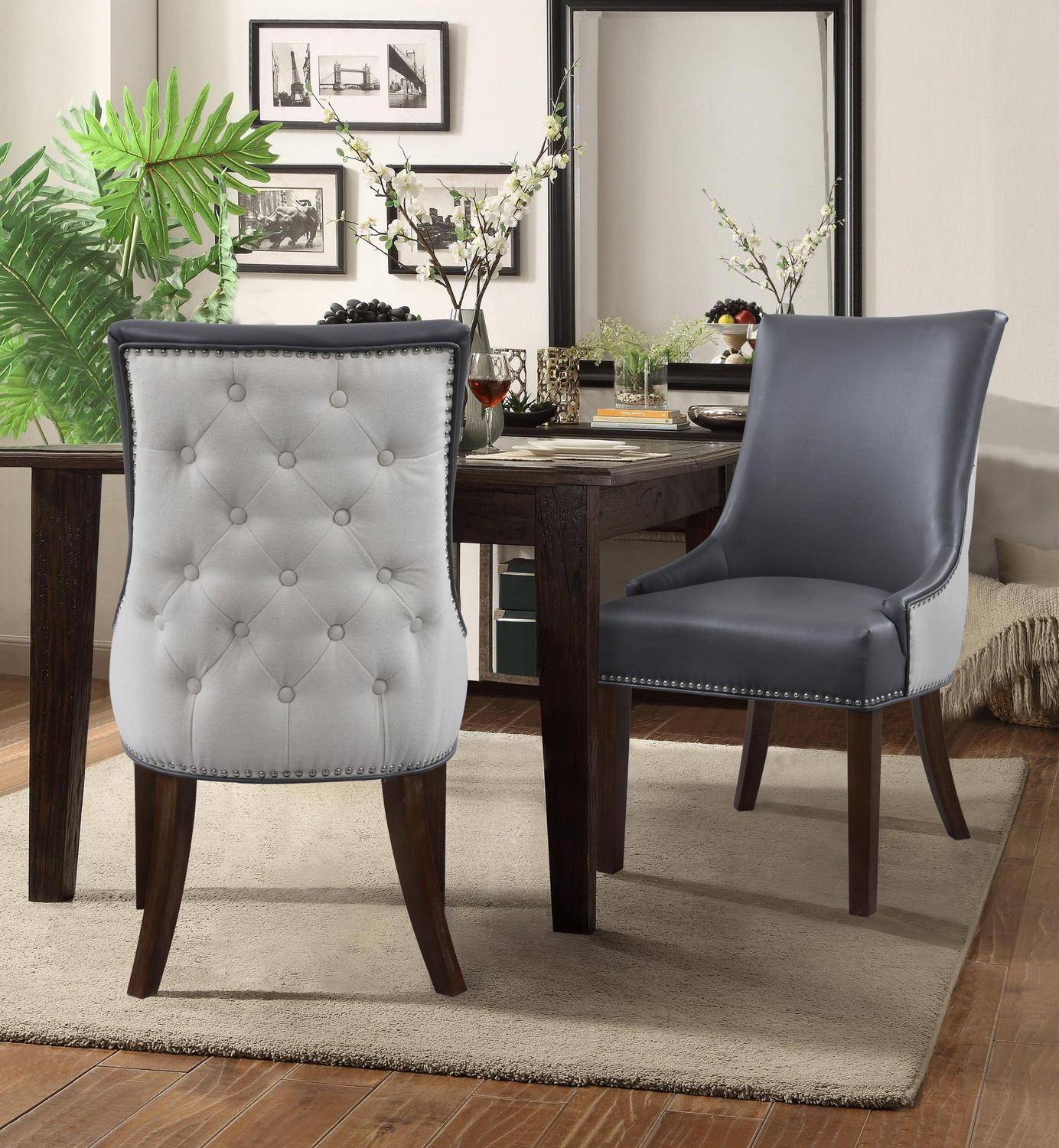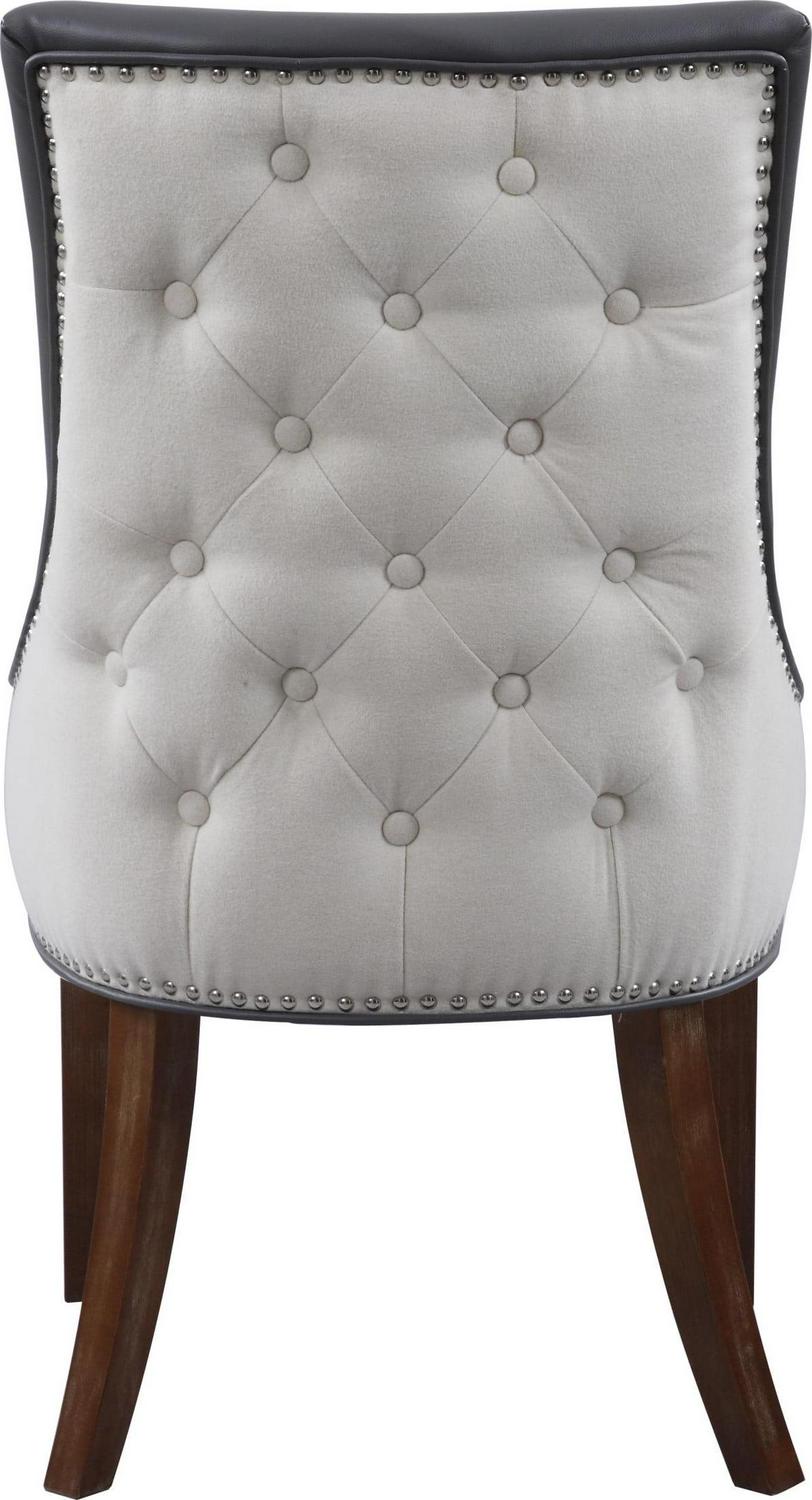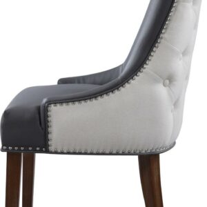 An updated interpretation of a classic dining chair. Design details abound from gentle swoop arms to the beautiful PU leather upholstery inside and button tufted linen upholstery on the outside. Tapered solid birch legs and silver nailhead trim complete the refined look that will complement a dining table or living area.
