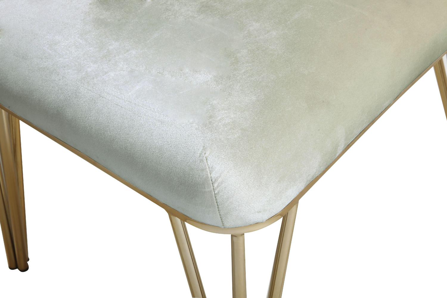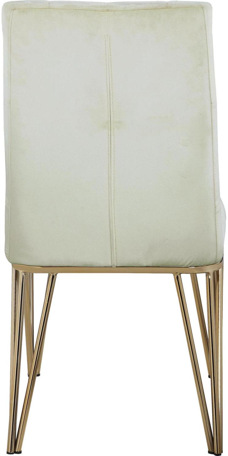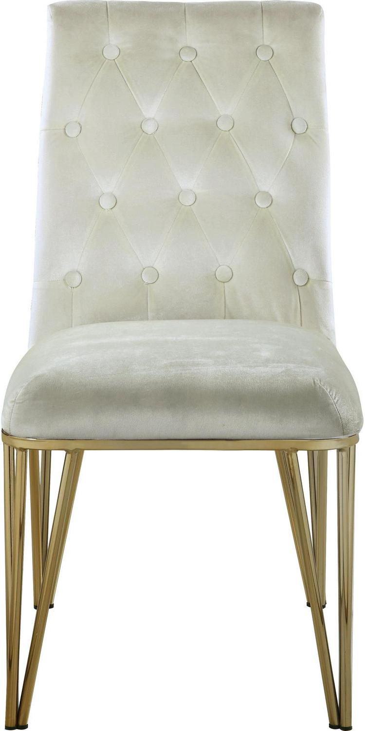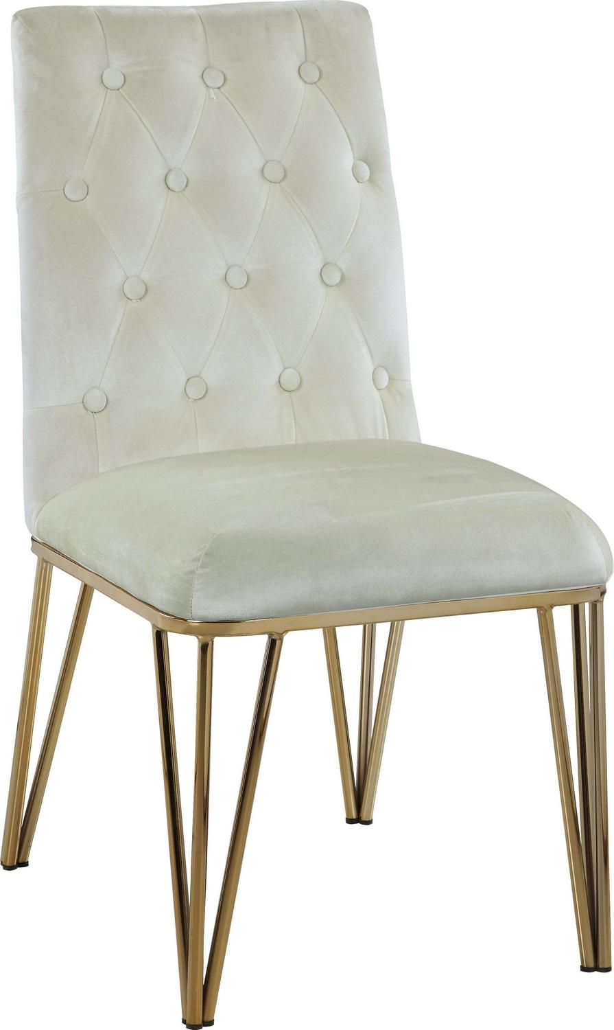 Clean lines define the unobtrusive, yet statement – making this dining chair. A button tufted, plush velvet back and seat sit a striking, gold tone solid metal base with spindle legs. Use in multiples in your dining room area.