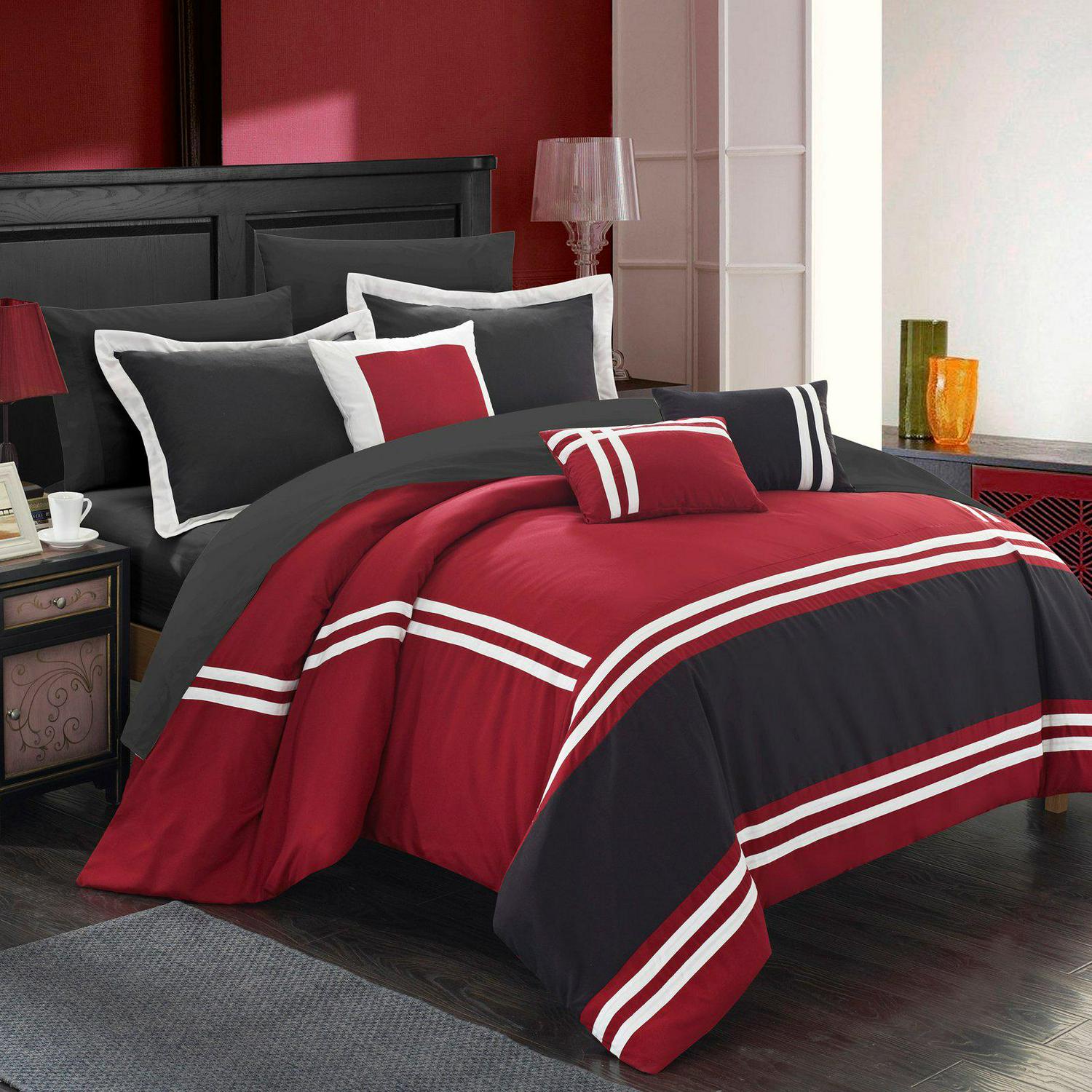 The comforter features a banded pieced color block design. Super soft microfiber sheet set, design coordinated shams and embellished deco pillows are included to complete the look.