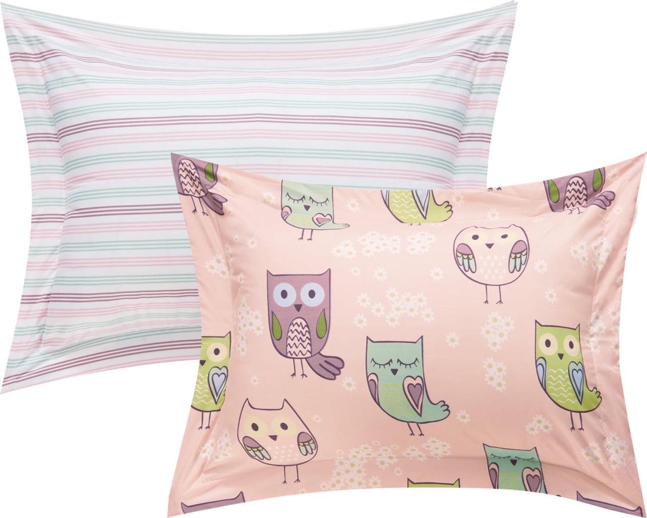 – IT S A HOOT – Fun and colorful design featuring cute hooting owls and floral details on a pink field with a pastel-colored striped design on the reverse – A design and color coordinated reversible pillow sham and a decorative pillow complete the look