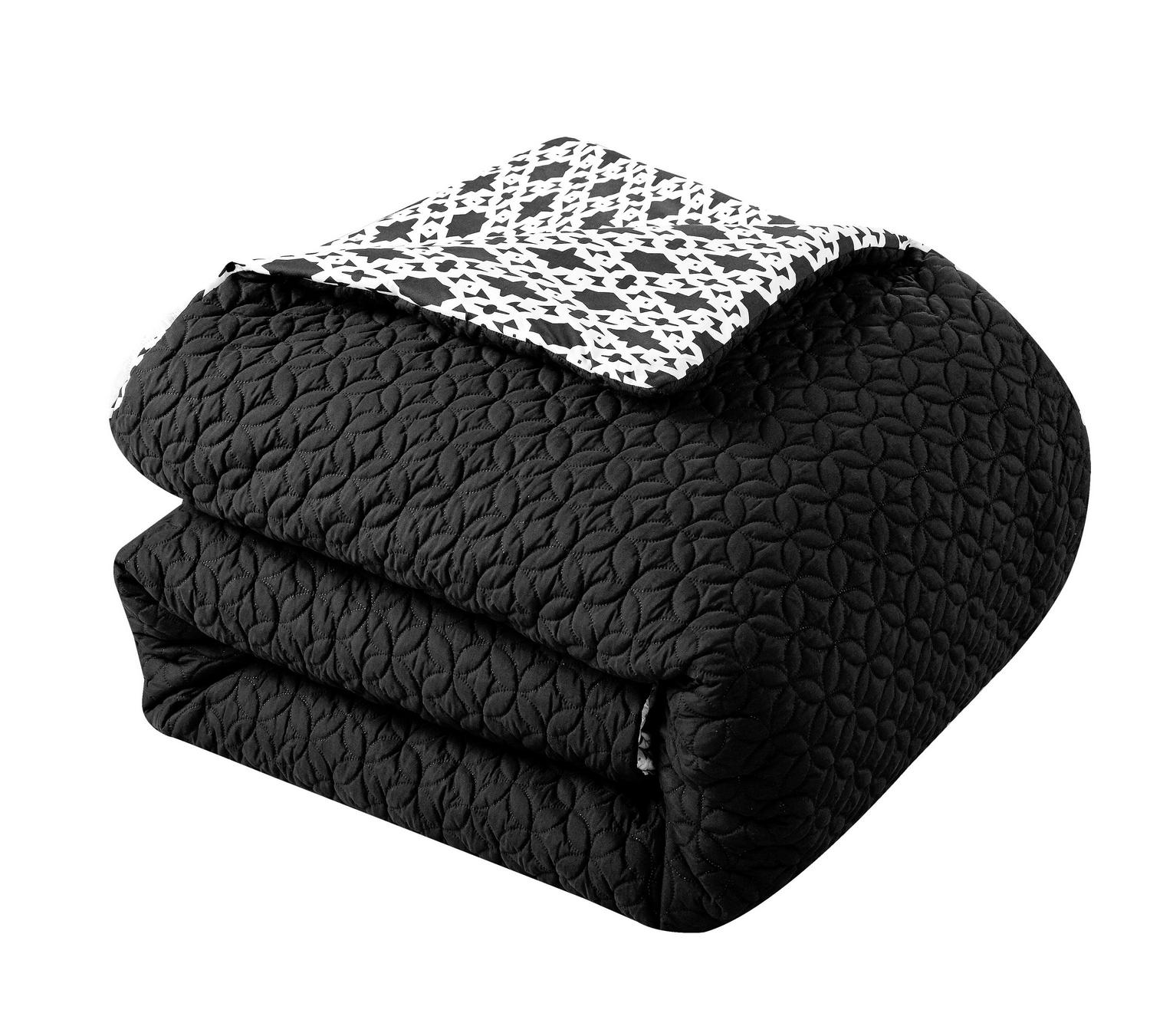 An elegant fashion forward bedding collection with everything you need for a complete bedroom décor makeover. Elegant and sophisticated quilting with two-tone geometric pattern print on the reverse. Super-soft microfiber sheets, design coordinated shams, trendy deco pillows and window treatments are included to complete the look.