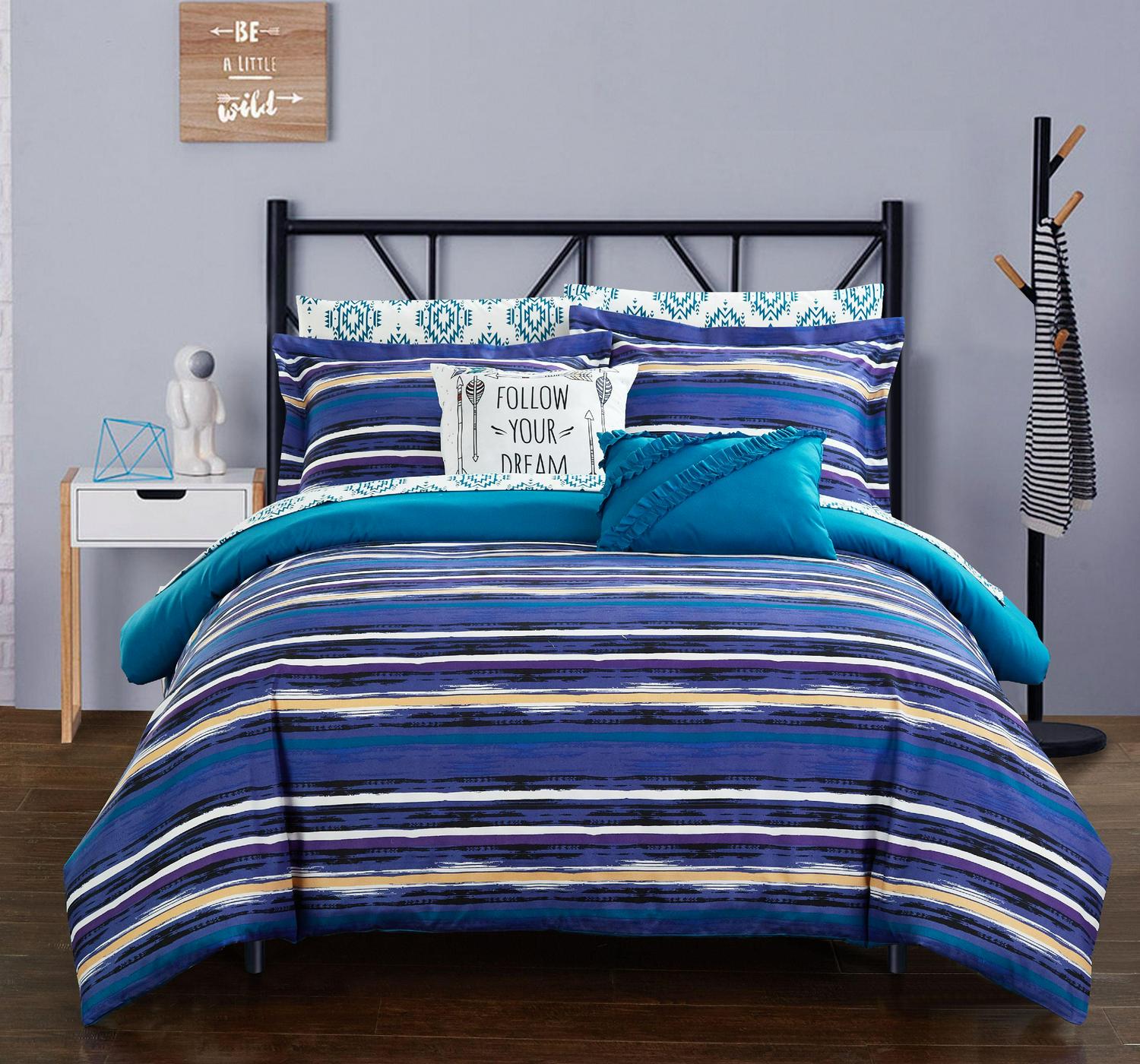 Designer bohemian inspired bohemian bedding collection include everything you need and all the details to perfect that Boho Chic look. Ultra contemporary artistic striped in a watermark technique face that is reversible to boho chic tribal Ikat pattern. Indulge in super soft microfiber sheets included in a coordinating Ikat boho pattern. Trendy inspirational boho pillows with a message follow your dreams included as well as a 4 piece microfiber coordinating sheet set to complete the look.