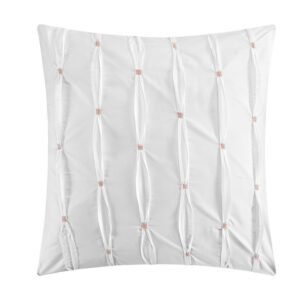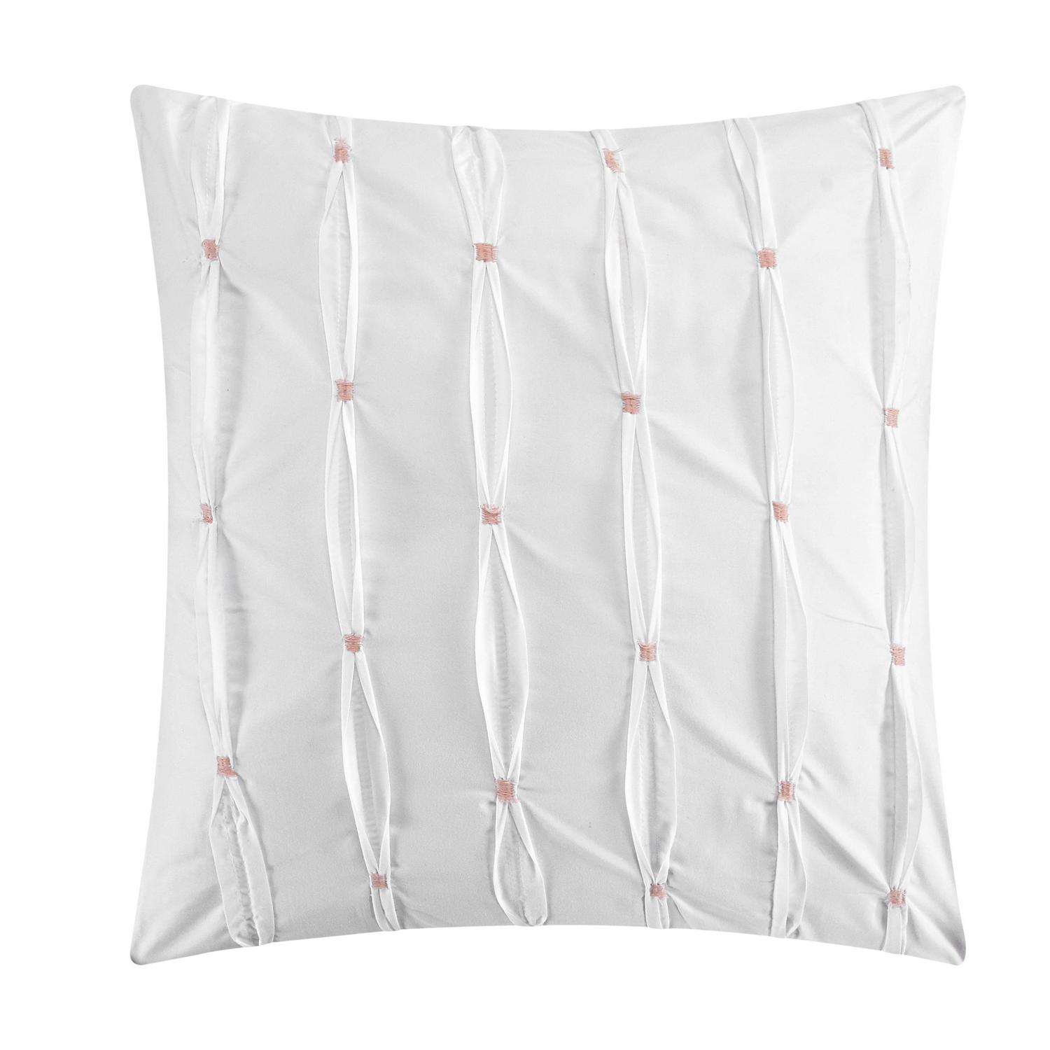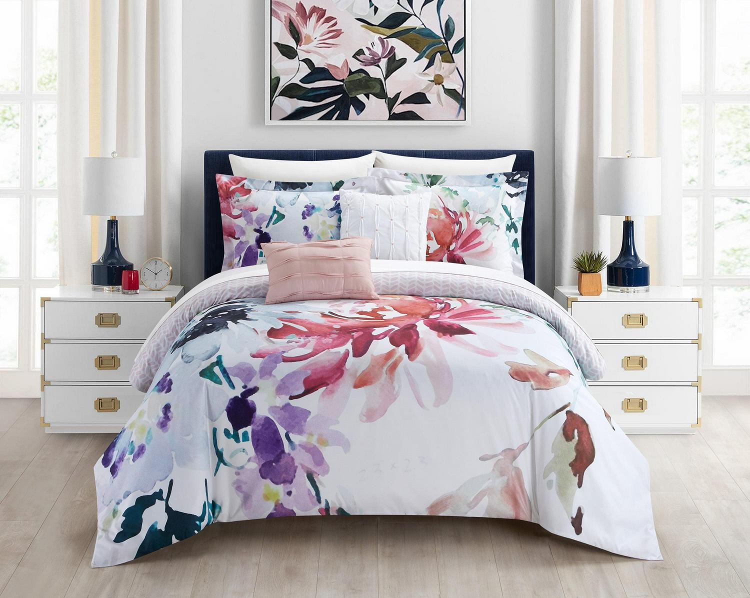 Create a flower garden oasis in your bedroom with the unique look of the Nitobe Gardens comforter set from Chic Home. This reversible comforter features a watercolor floral theme in a palette of subdued purples, pinks, reds and blues on the face with a geometric blush pink pattern on the reverse. Complete the contemporary floral theme with the included deco pillows and design coordinated floral sham or mix and match with your own pieces for a distinct look. A three piece sheet set (1 fitted sheet, 1 flat sheet and 1 pillowcase) is included with every set.
