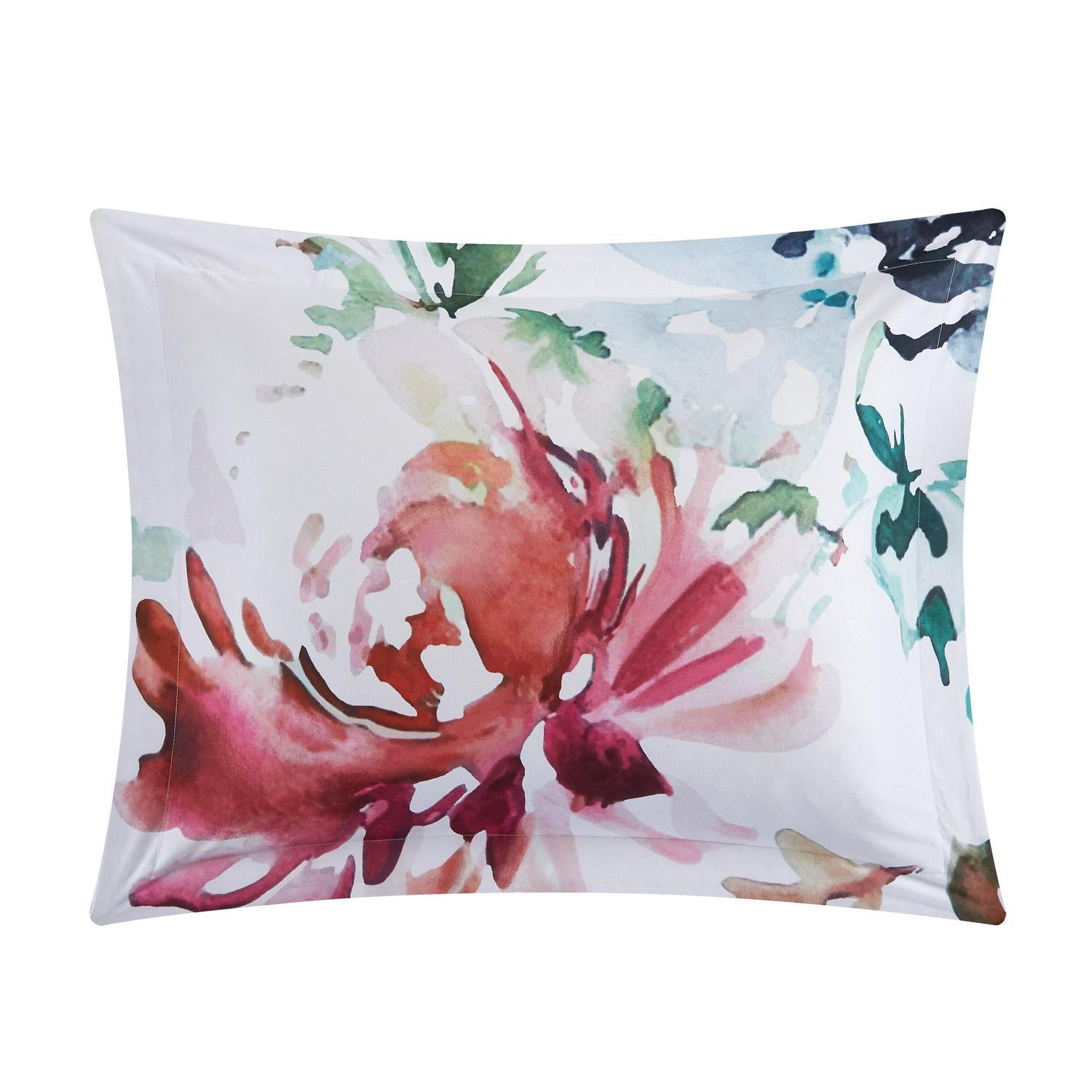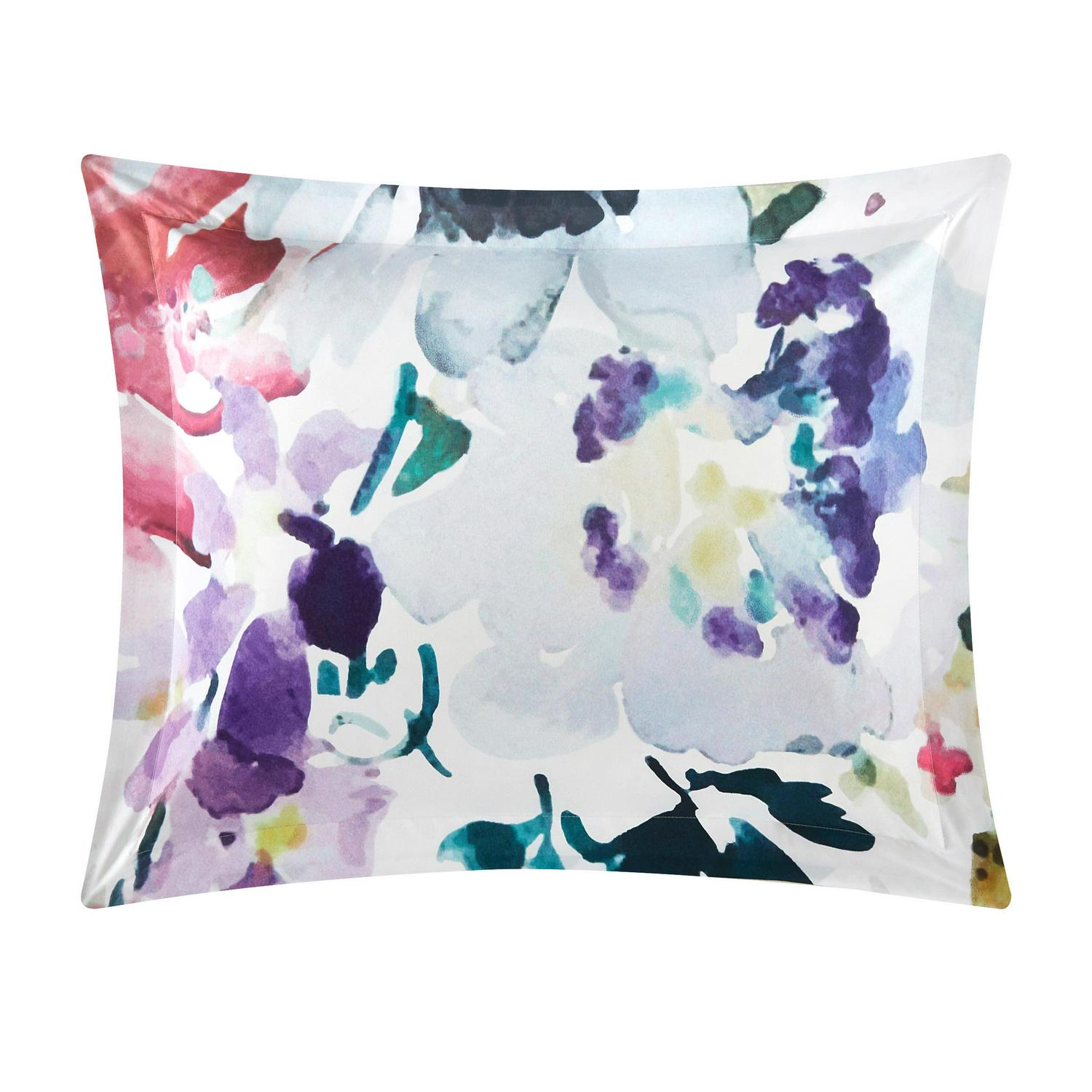 – FLORAL WATERCOLOR DESIGN – Watercolor floral theme in a gorgeous palette of purples, pinks, reds and blues on the face with a geometric blush pink pattern on the reverse – An embellished floral pillow sham is included